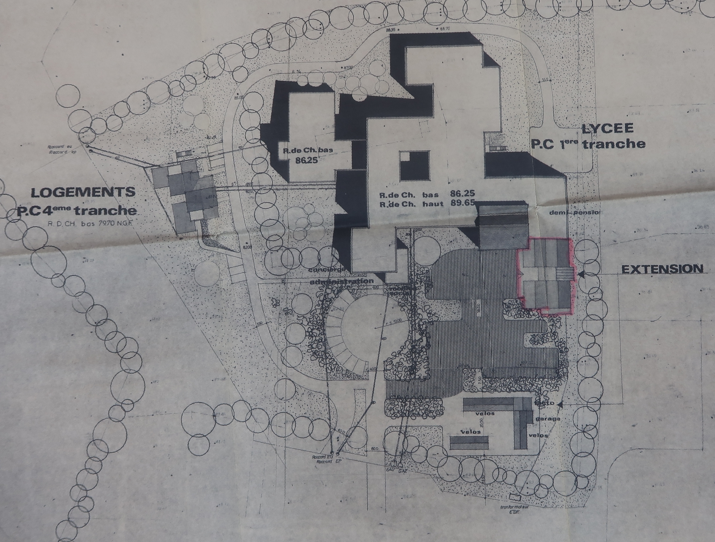 Extension 6 classes. Plan de Masse. Yves Guillou, architecte, 18/02/1983.Immatriculation