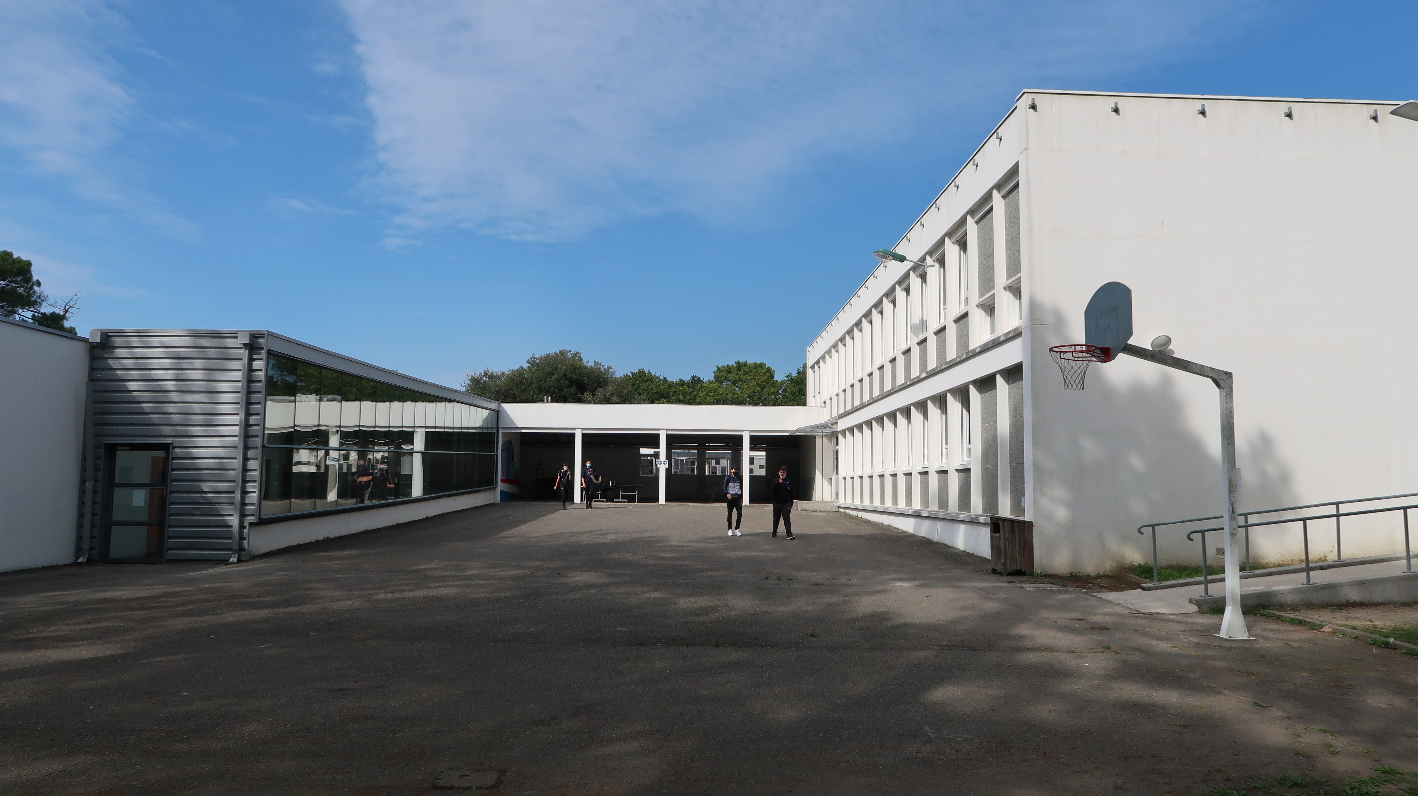 Ateliers et externat : vue prise du sud. Yves Guillou, architecte, 1969.