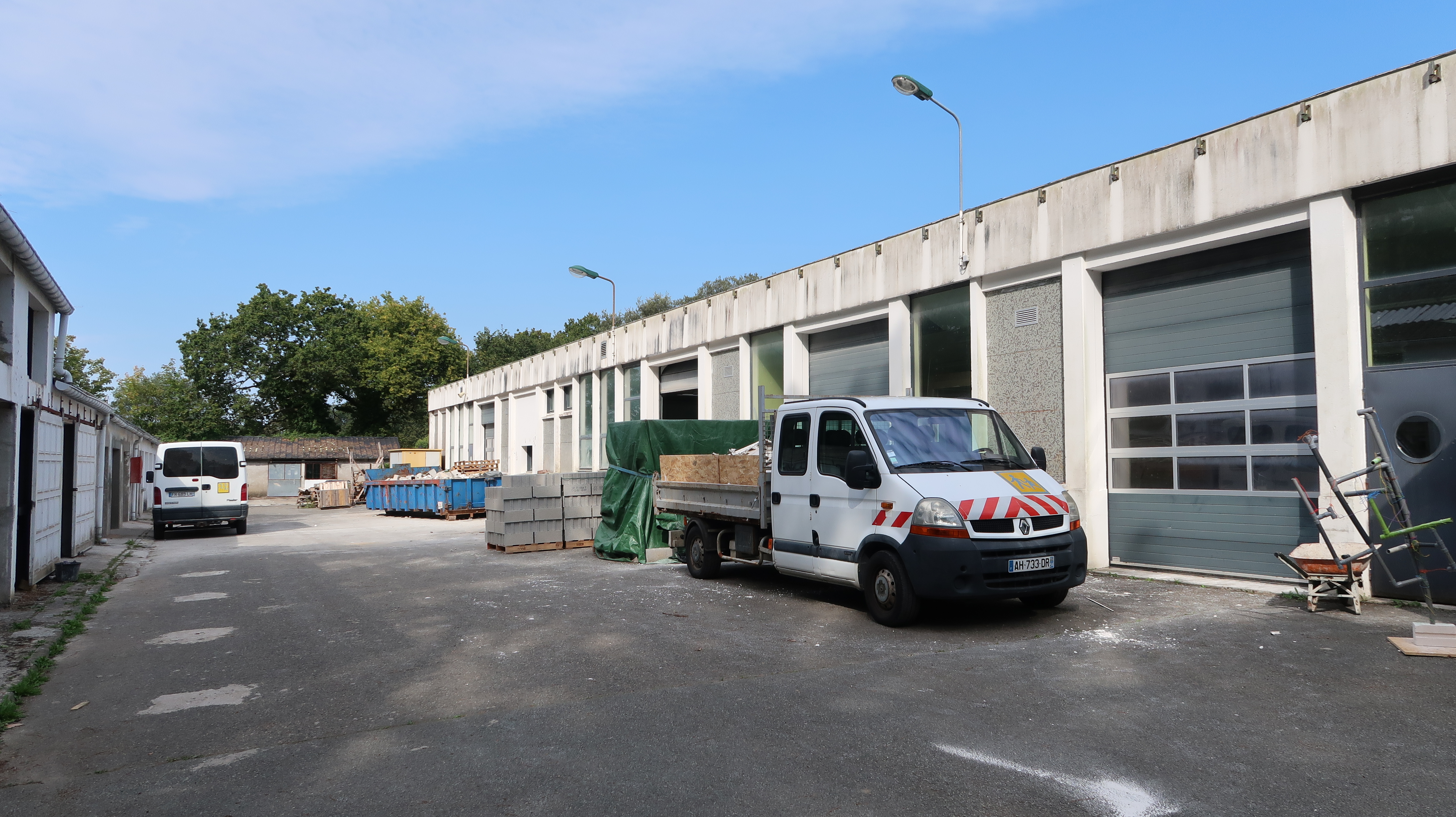 Ateliers, façade ouest. Yves Guillou, architecte, 1969. A gauche, garages et stockages.Immatriculation