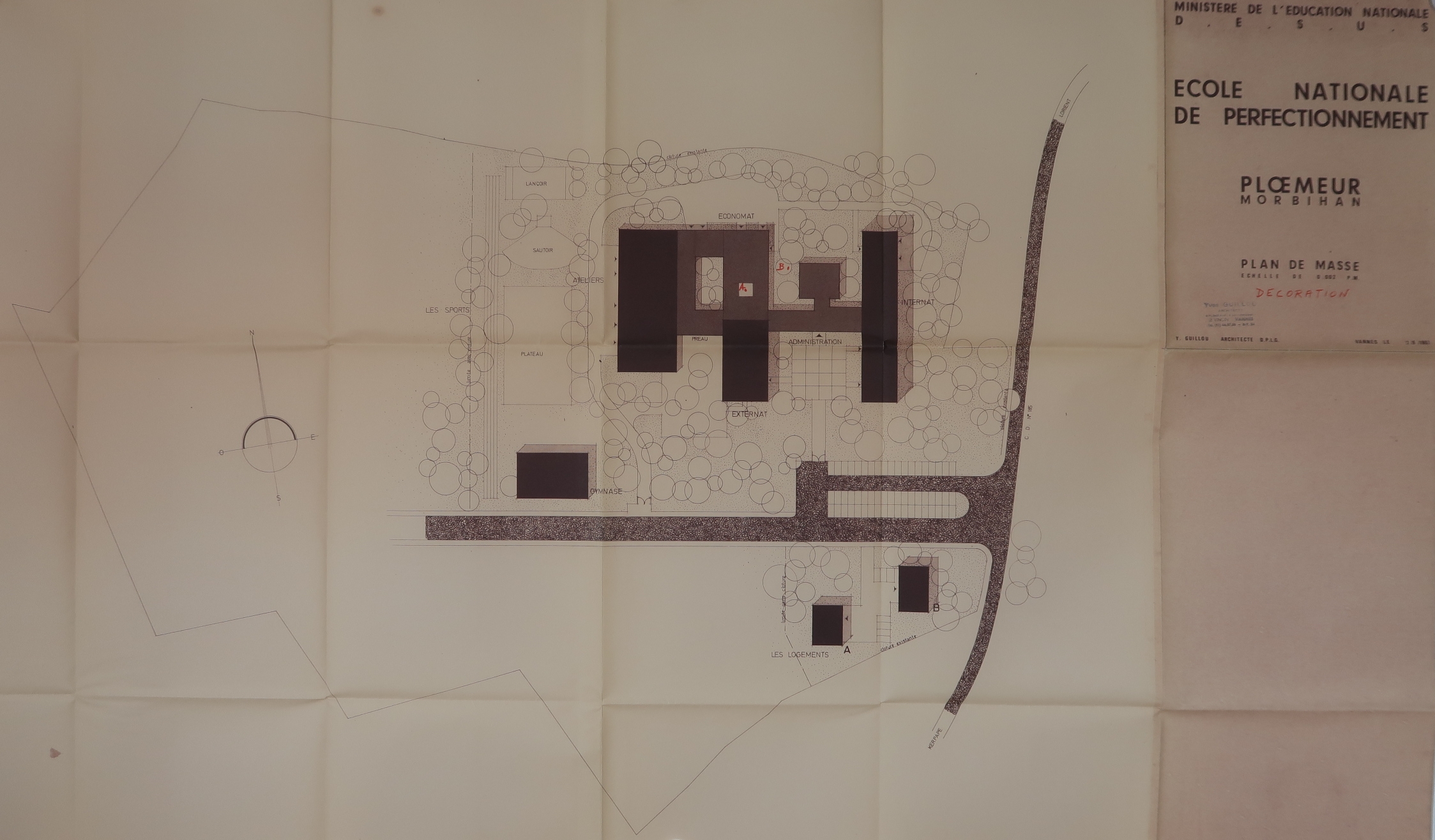 Plan de masse (Yves Guillou, architecte, 1967) sur lequel figurent les deux emplacements prévus pour les deux projets initiaux de décoration. La sculpture réalisée par Marie-Thérèse Pinto, en 1972, est implantée ailleurs, sur une pelouse, devant l'angle sud-est des bâtiments de l'administration et de l'externat.Immatriculation