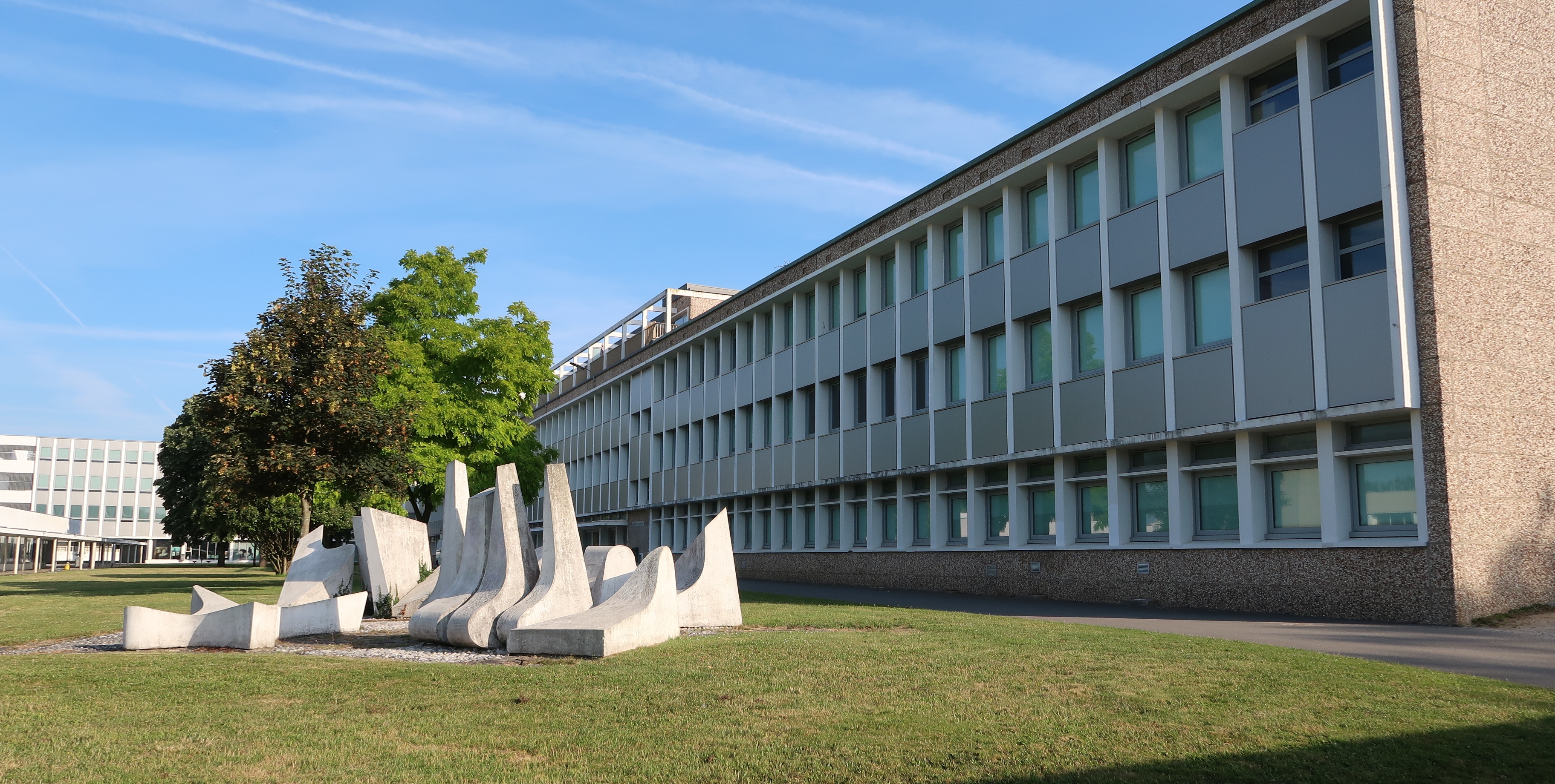 Sculpture (Roger Joncourt, Jean-Paul Jappé, Joël Moulin, plasticiens). Vue prise du sud-est. A droite, le bâtiment scientifique.Immatriculation