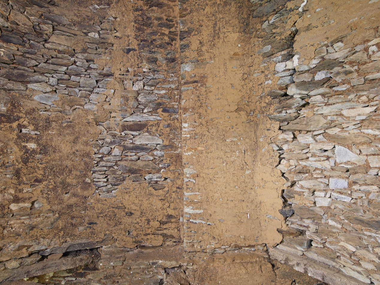 Intérieur, vue des parois de l'étage : les trous de boulins semblent avoir été bouchés.Immatriculation
