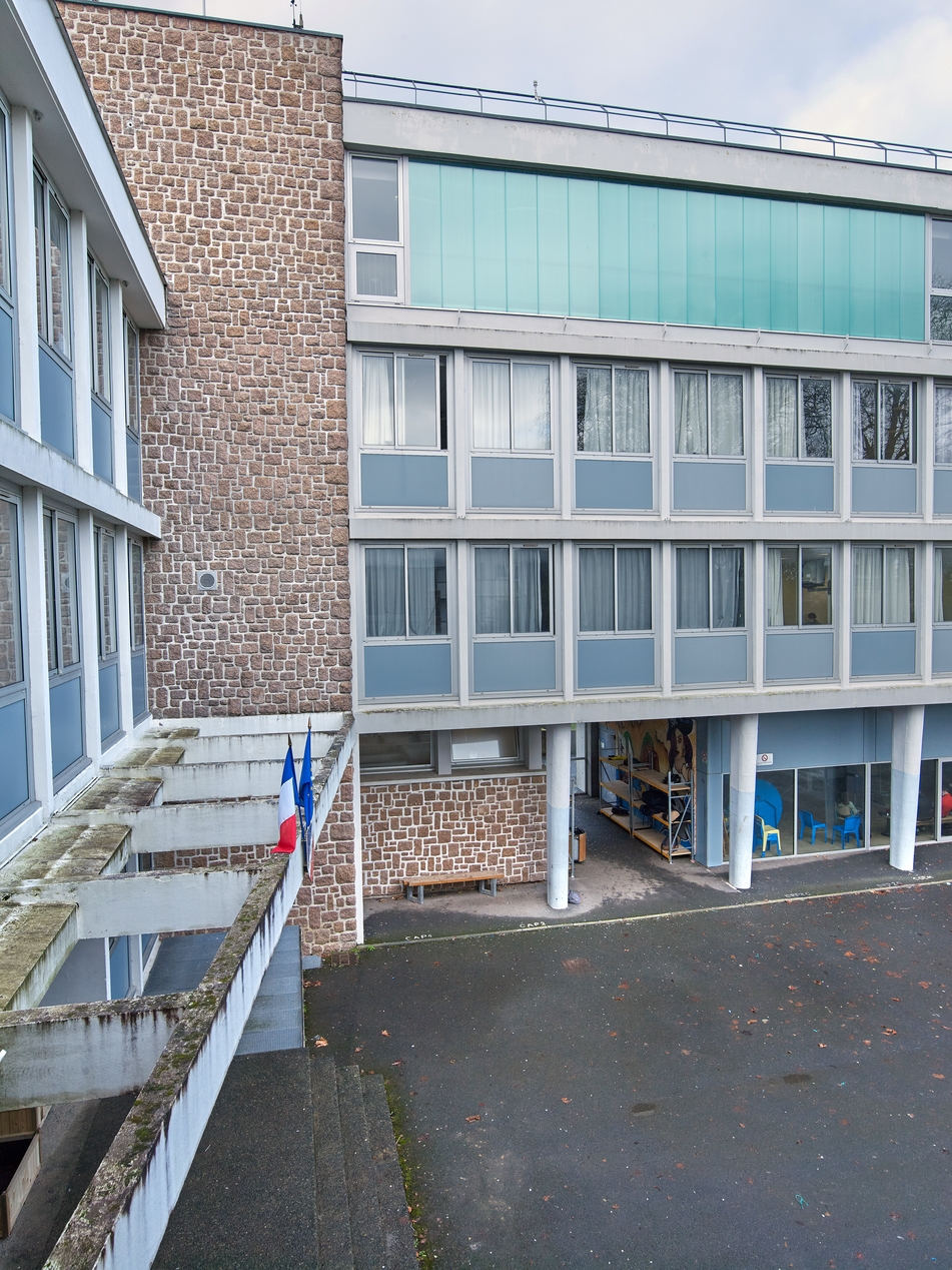 Entrée de l'internat-externat, située dans le retour d'équerre reliant les deux barres. Noter le auvent ajouré. La coursive du dernier étage a disparu derrière une cloison. R. Hummel, R. Rolland et A. Weinstein, architectes, 1961.Immatriculation
