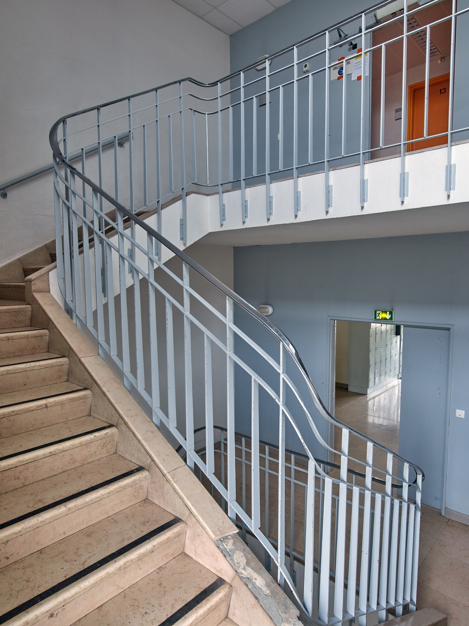 Cage d'escalier dans l'externat (R. Hummel, R. Rolland et A. Weinstein, architectes, 1962). Noter la qualité des matériaux. La rampe ajoutée sur les murs est liée à une mise aux normes de sécurité ultérieure.Immatriculation