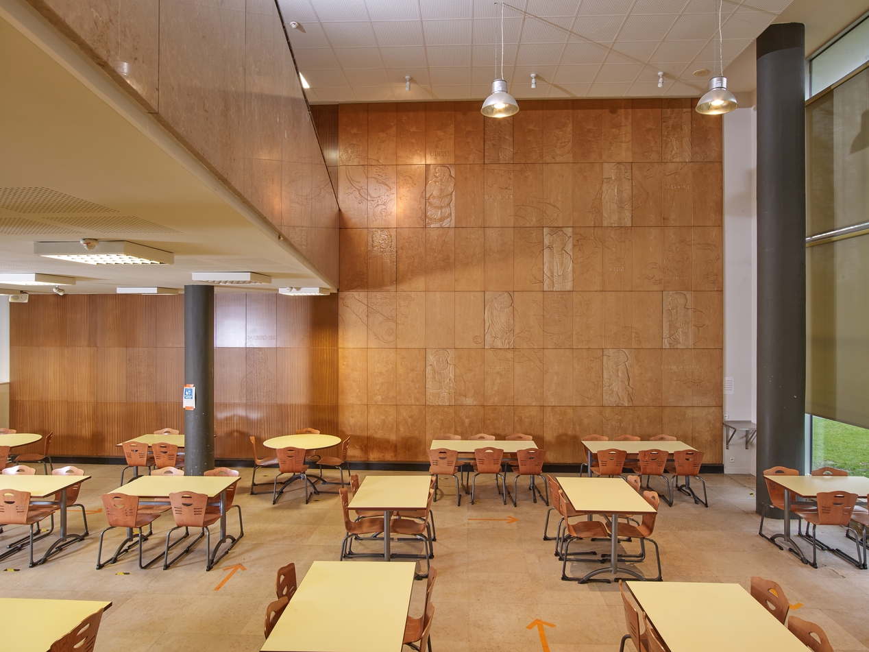 Réfectoire, vue d'ensemble (R. Hummel, R. Rolland et A. Weinstein, architectes, 1961). A l'origine, le rez-de-chaussée était un hall - foyer et la mezzanine accueillait seule le réfectoire. Sur le mur du fond, décoration du sculpteur Séraphin Gilly (1963) : "Les grands marins de tous les temps".Immatriculation