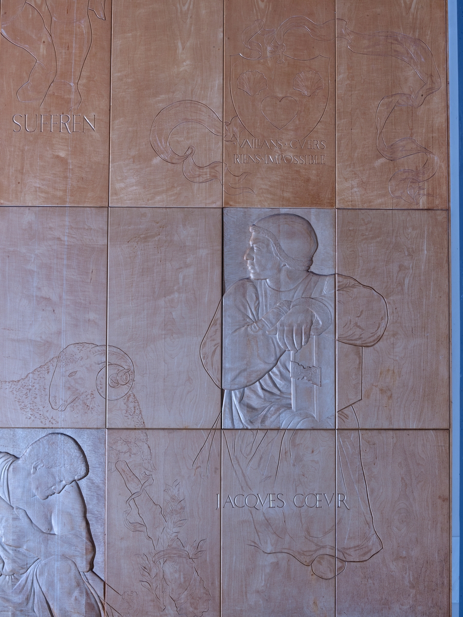 Ensemble sculpté de Séraphin Gilly (1963), "Les grands marins de tous les temps". Vue de détail : Jacques Cœur. Le panneau central est sculpté plus profondément, jusqu'au cœur en sycomore, tandis que les panneaux périphériques sont simplement gravés dans l'épaisseur de l'acajou.Immatriculation