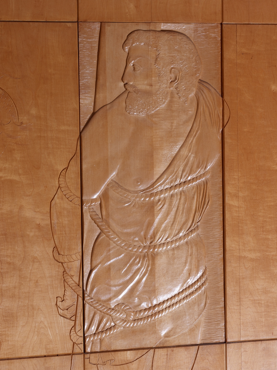 Ensemble sculpté de Séraphin Gilly (1963), "Les grands marins de tous les temps". Vue de détail : Ulysse. Le panneau central est sculpté plus profondément, jusqu'au cœur en sycomore, tandis que les panneaux périphériques sont simplement gravés dans l'épaisseur de l'acajou.Immatriculation