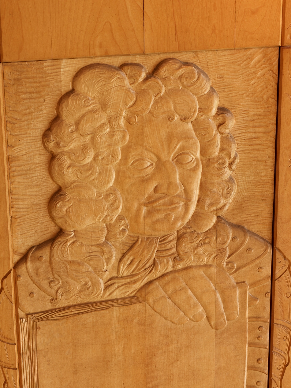 Ensemble sculpté de Séraphin Gilly (1963), "Les grands marins de tous les temps". Vue de détail : Duquesne.Immatriculation