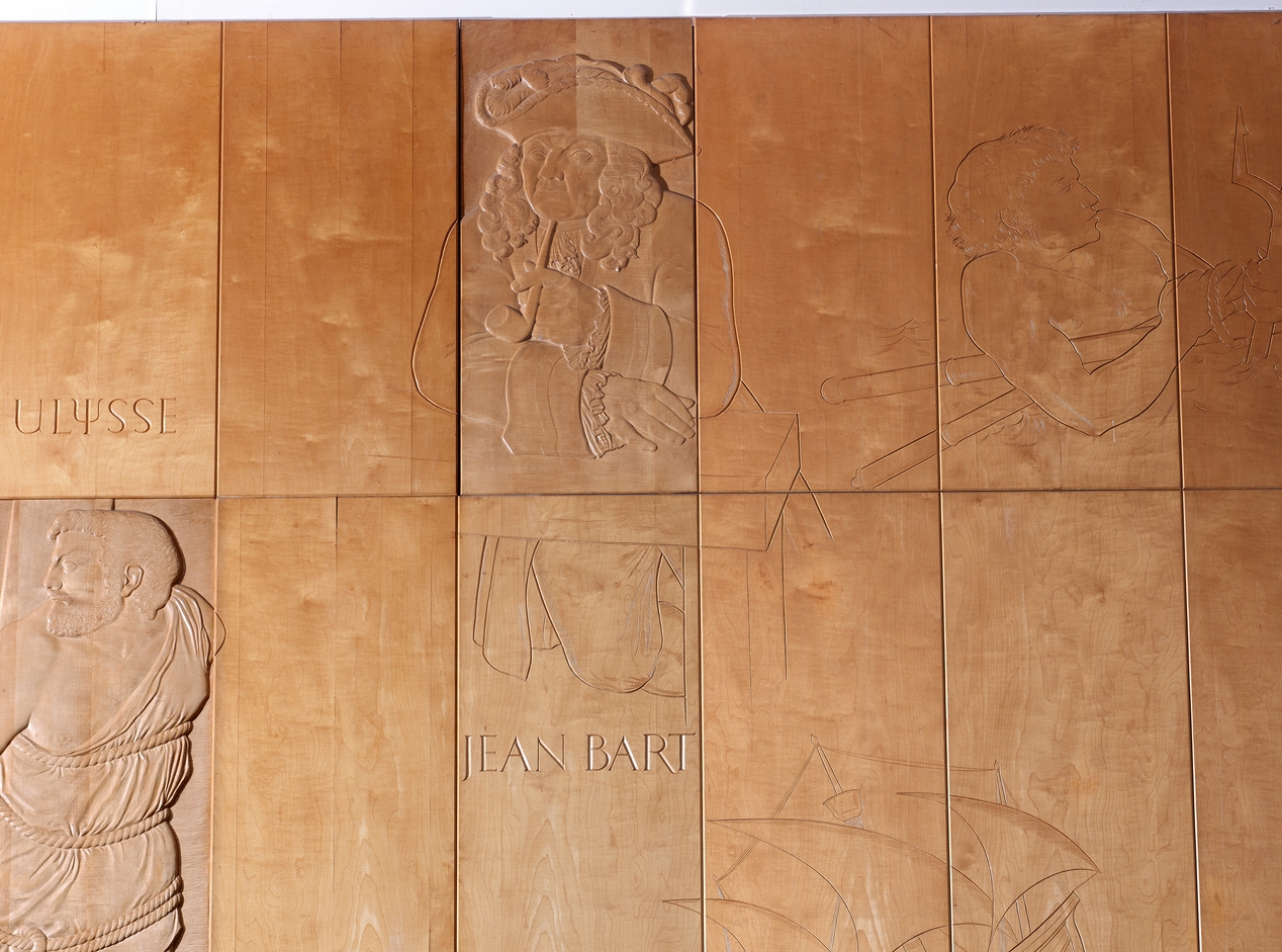 Ensemble sculpté de Séraphin Gilly (1963), "Les grands marins de tous les temps". Vue de détail : Jean Bart et Ulysse (parteil). Les panneaux consacrés aux marins sont sculptés plus profondément, jusqu'au cœur en sycomore, tandis que les panneaux périphériques sont simplement gravés dans l'épaisseur de l'acajou.Immatriculation