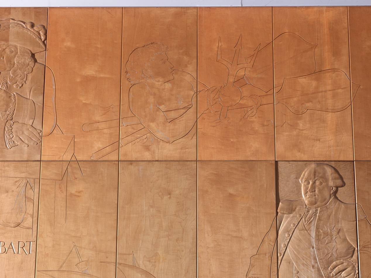 Ensemble sculpté de Séraphin Gilly (1963), "Les grands marins de tous les temps". Vue de détail : un naufragé, situé entre Jean Bart, Surcouf et Suffren.Immatriculation