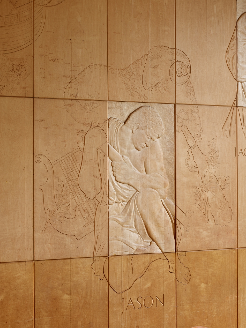 Ensemble sculpté de Séraphin Gilly (1963), "Les grands marins de tous les temps". Vue de détail : Jason. Le panneau central est sculpté plus profondément, jusqu'au cœur en sycomore, tandis que les panneaux périphériques sont simplement gravés dans l'épaisseur de l'acajou.Immatriculation