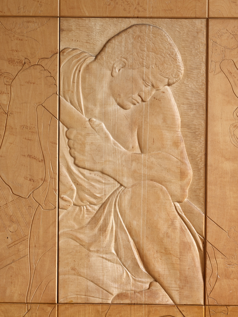 Ensemble sculpté de Séraphin Gilly (1963), "Les grands marins de tous les temps". Vue de détail : Jason. Le panneau central est sculpté plus profondément, jusqu'au cœur en sycomore, tandis que les panneaux périphériques sont simplement gravés dans l'épaisseur de l'acajou.Immatriculation