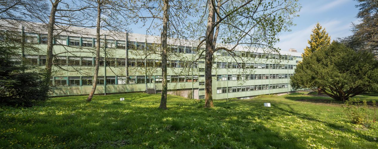 Vue d'ensemble de la façade est du bâtiment A. Noter l'adaptation à la déclivité du terrain, avec un étage supplémentaire au nord. (André Remondet et Patrice Simon, architectes, 1961).Immatriculation