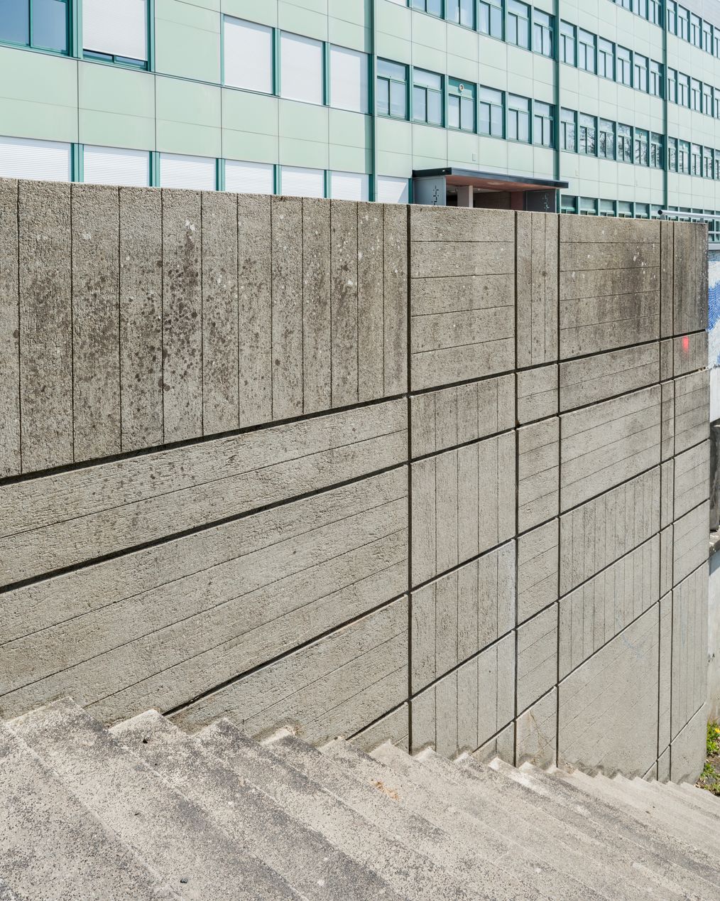 Escalier extérieur et mur de soutènement de la cour située en rez-de-chaussée haut. Noter le décor issu d'un calepinage soigné du béton. (André Remondet et Patrice Simon, architectes, 1961).Immatriculation