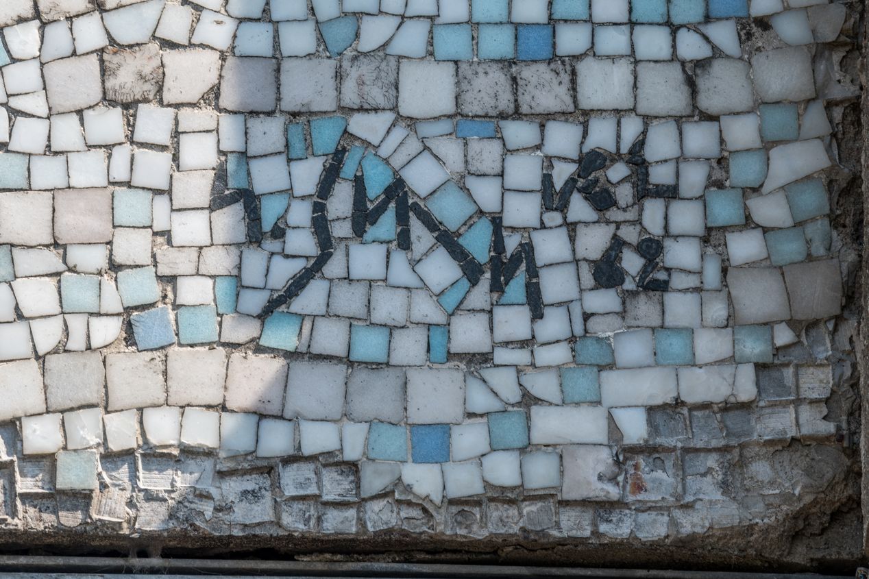 Détail sur la signature de la mosaïque monumentale de Gustave Singier (1962), sur le garde-corps de la cour située en rez-de-chaussée haut.Immatriculation