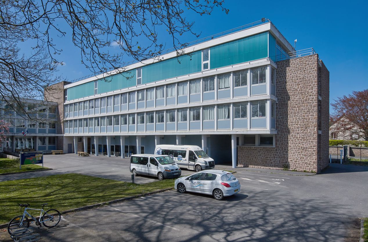 Vue d'ensemble prise du sud-est. A gauche, l'administration, à droite, l'externat. Noter l'inclinaison des poteaux du rez-de-chaussée, qui fait penser à un ber. Le plexiglass vert, au dernier niveau, est un ajout qui ferme la "coursive". R. Hummel, R. Rolland et A. Weinstein, architectes, 1961.Immatriculation