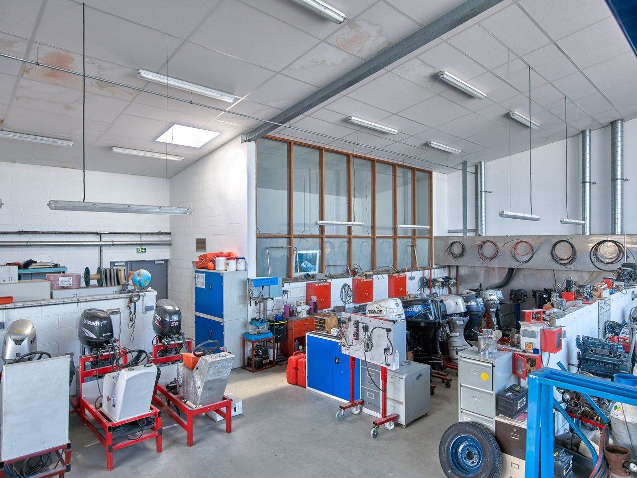 Ateliers, à Kerpalud. Vue intérieure de l'atelier moteurs hors-bords.Immatriculation