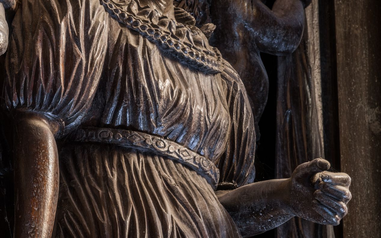 Vue de détail des plis de la robe et de la main droite tenant un attribut disparuImmatriculation