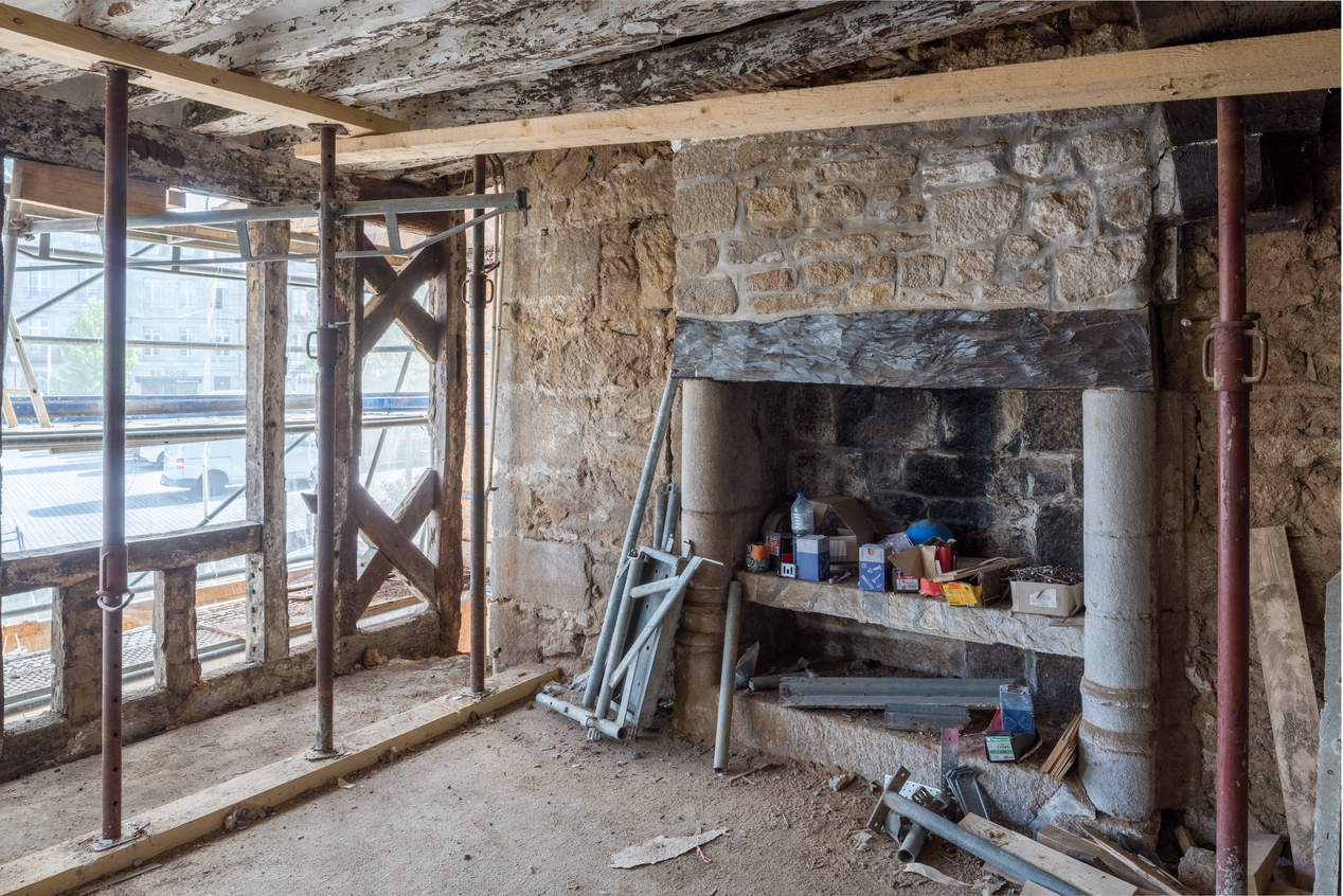 Cheminée sur le mur gouttereau est du premier étage (restauration en 2021).Immatriculation