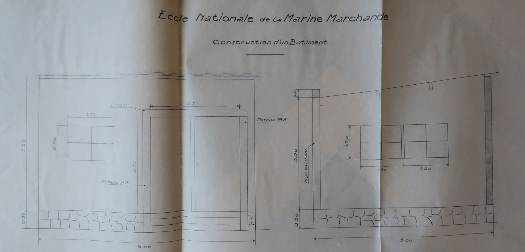 École nationale de la marine marchande. Construction d'un bâtiment. SD, vers 1960.Immatriculation