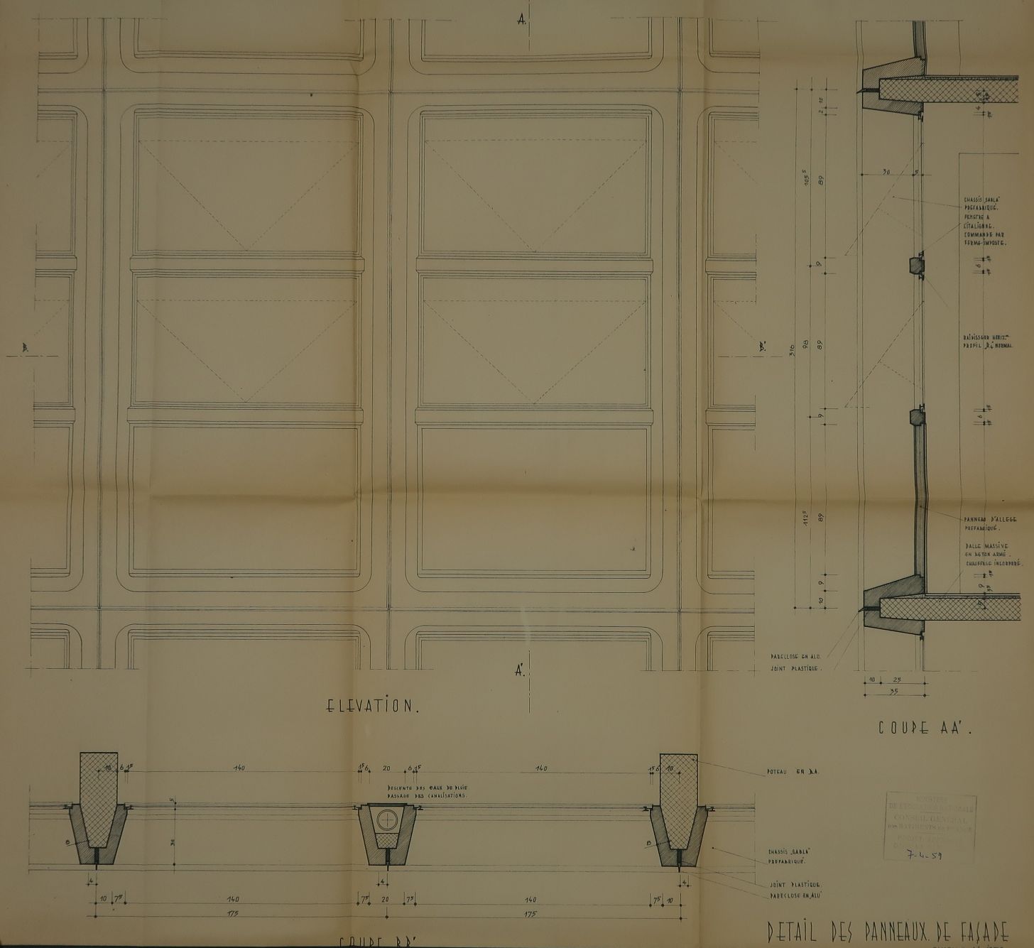 Détail des panneaux de façade. Le principe d'une façade rideau a été retenu. André Remondet et Patrice Simon, architectes, 23 janvier 1959.Immatriculation