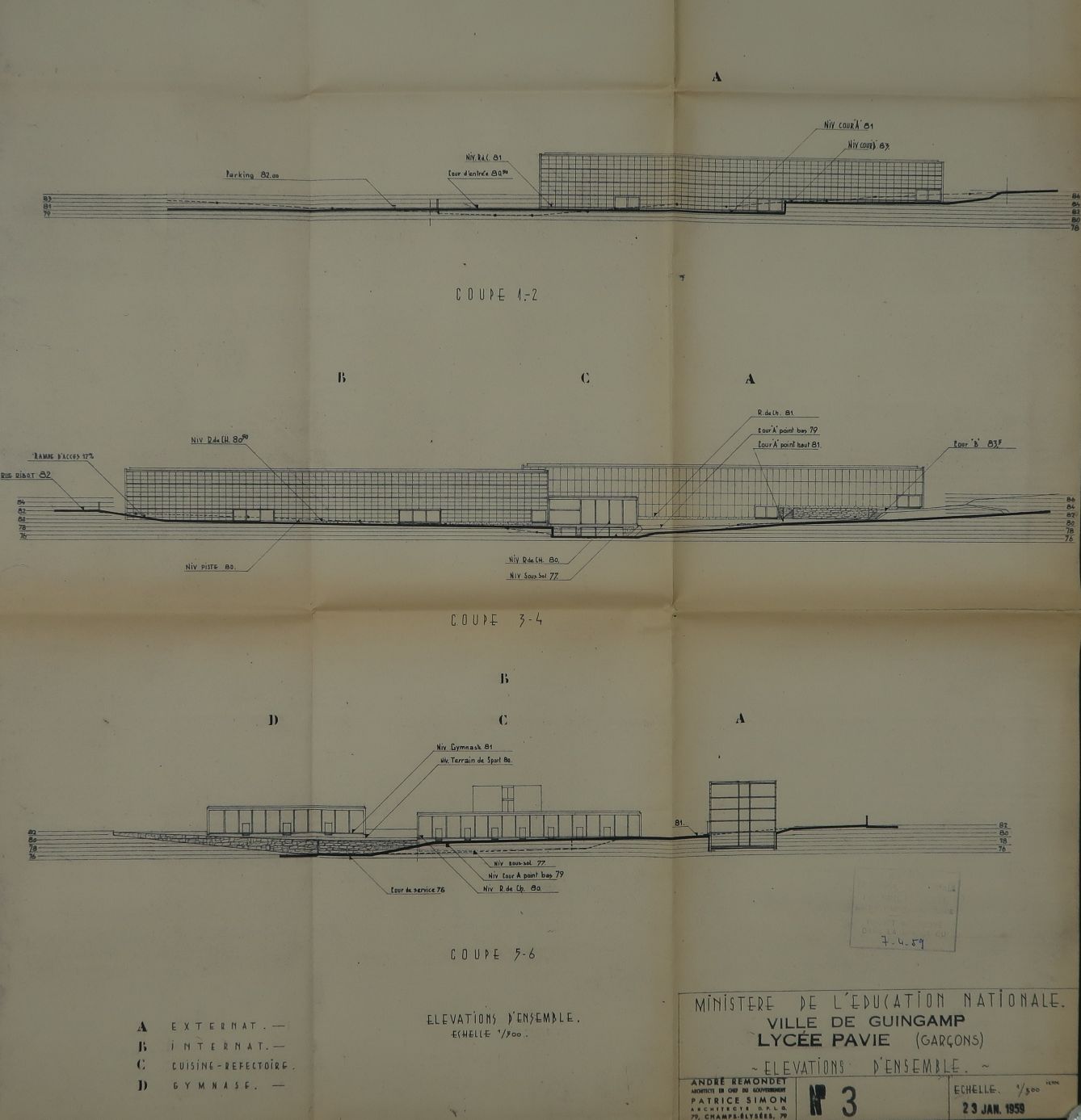 Élévations d'ensemble. André Remondet et Patrice Simon, architectes, 23 janvier 1959.Immatriculation