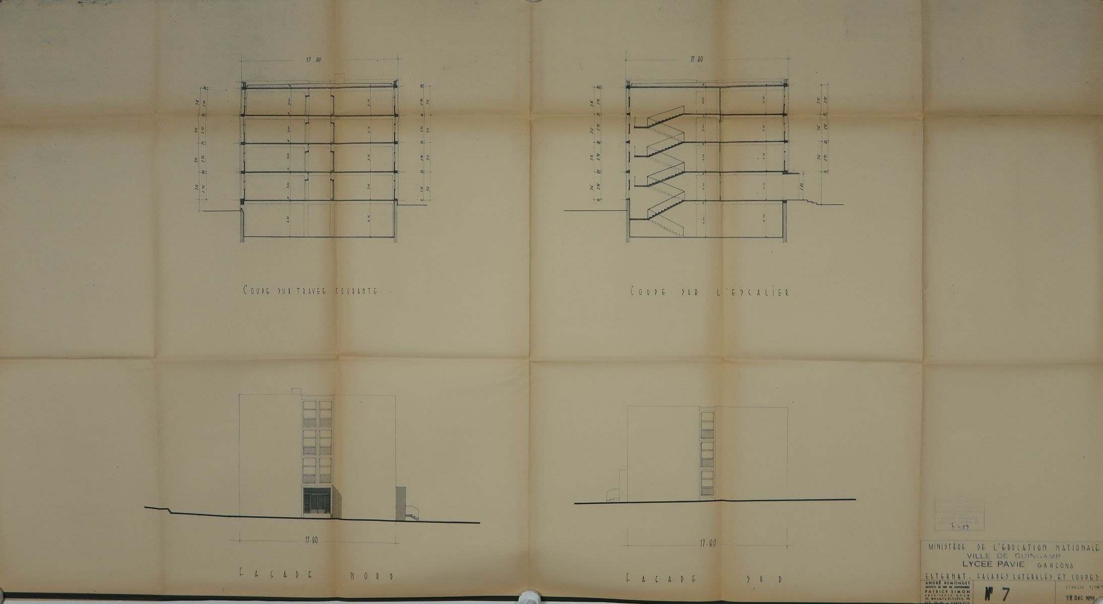 Externat. Façades latérales et coupes. André Remondet et Patrice Simon, architectes, 18 décembre 1958. Noter, à ce stade des études, l'absence de modénature.Immatriculation