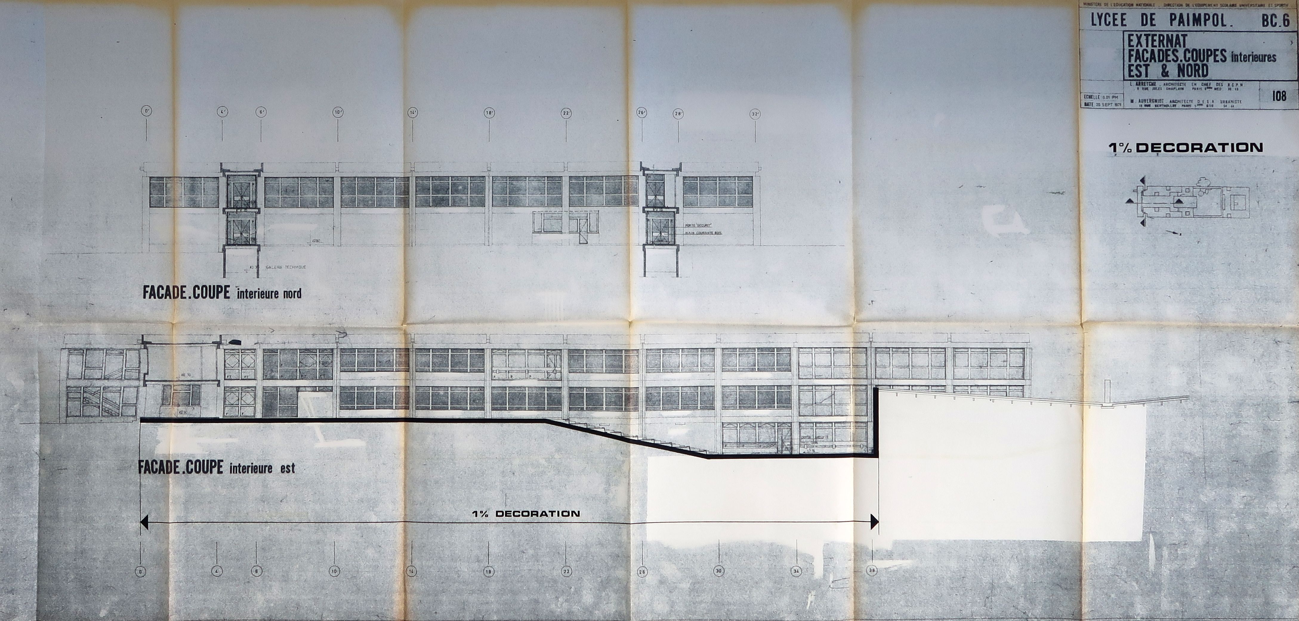 "1% décoration. Externat, façades coupes intérieures, est & nord"". L. Arretche et M. Auvergniot, architectes, 20.09.1971.Immatriculation
