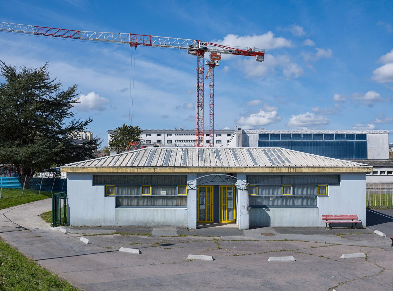 Bâtiment Q : enseignements artistiques (ateliers et salle de musique) (vers 1991), façade est. Au deuxième plan, le chantier du nouvel internat (2021) et façade est d'un gymnase.Immatriculation