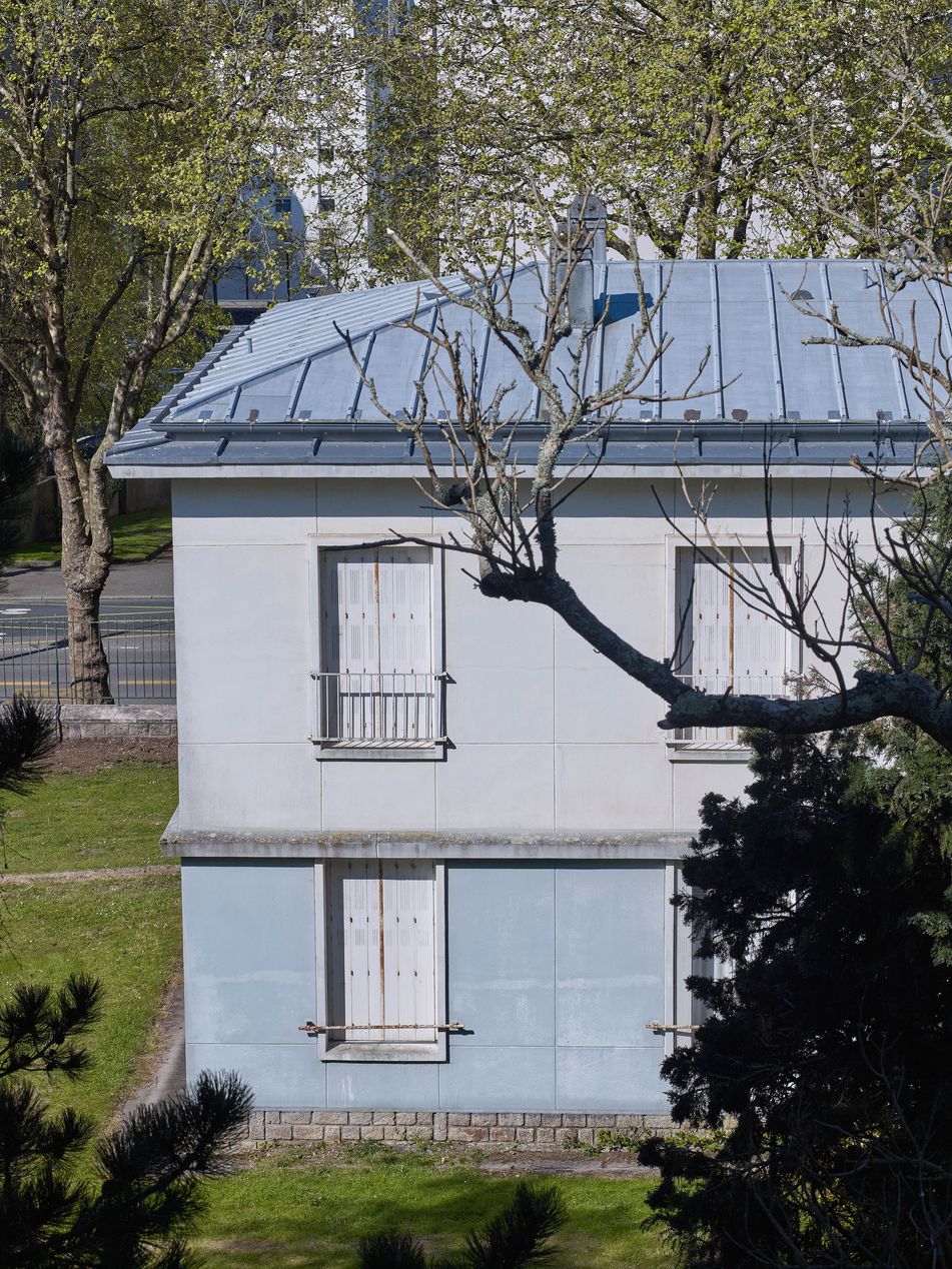 Logements, façade est, vue partielle prise des étages du bâtiment E (J-B. Mathon, architecte).Immatriculation