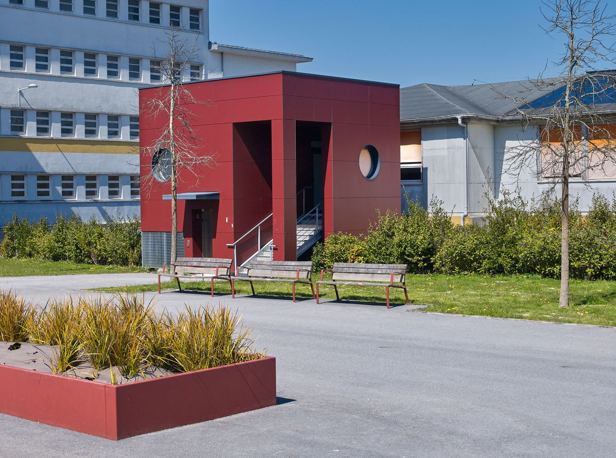 Edicule devant la façade sud du bâtiment V : une mise aux normes d'accessibilité soignée. Atelier Rubin, architectes, vers 2016.Immatriculation