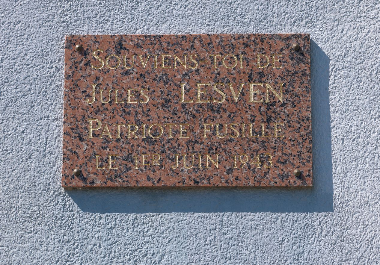 Plaque commémorative. Le lycée a pris le nom du résistant communiste Jules Lesven, responsable interrégional des FTP, fusillé en 1943 (qui donne également son nom à la rue le long de laquelle se situe l'entrée est de la cité scolaire et le lycée Lesven).Immatriculation
