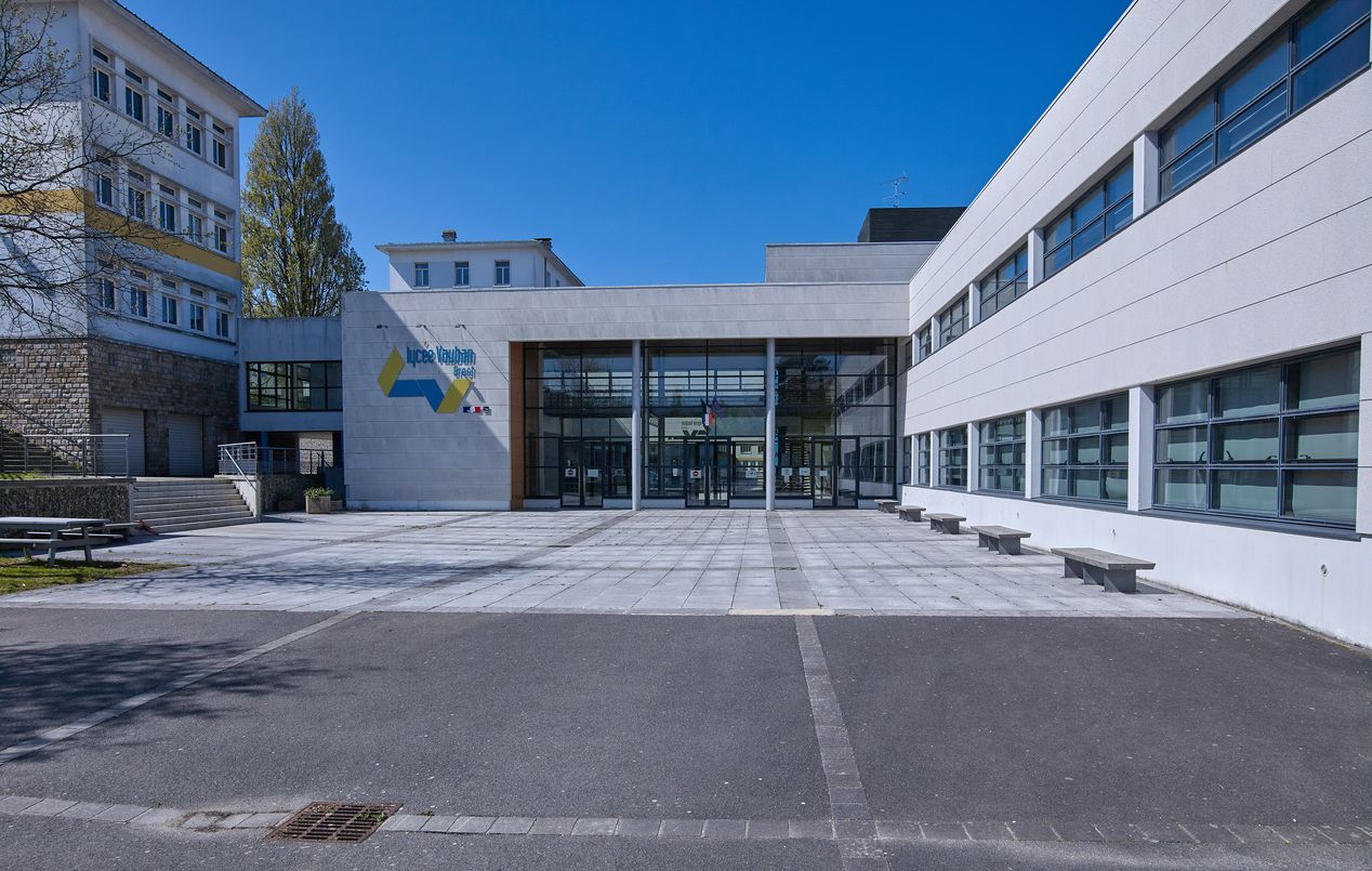 Entrée du lycée, façades ouest et externat, façade sud (vue prise de l'ouest). Archipole Urbanisme et Architecture, 2005. A gauche, pignon nord de l'externat du lycée Jules Lesven (J-B. Mathon, architecte).Immatriculation