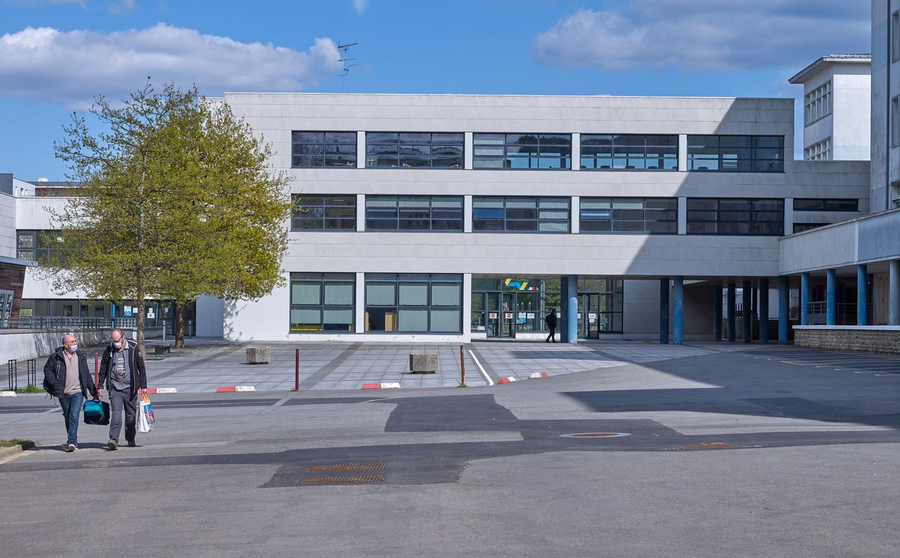 Bâtiment W : accueil, administration, façade ouest. La "galerie" de liaison avec l'externat N (à droite), permet de "donner" une cour intérieure au lycée Vauban, séparée des autres établissements. Archipole Urbanisme et Architecture, 2005.Immatriculation
