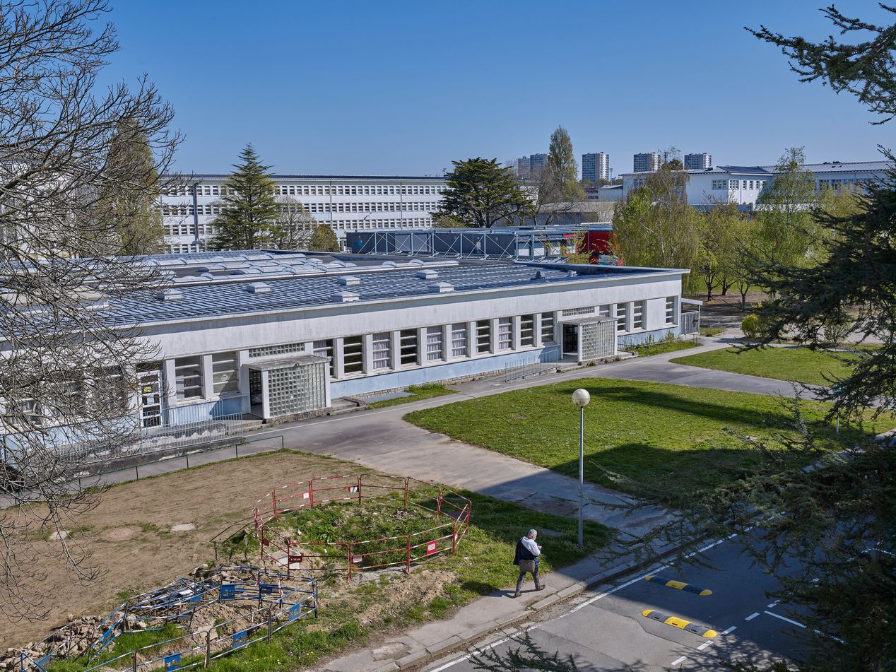 Vue d'ensemble partielle prise d'un étage du bâtiment E. Au premier plan, les réfectoires. A l'arrière plan, un externat du lycée Vauban (N), le lycée La Pérouse-Kerichen (J-B. Mathon, architecte) et les tours du quartier de Pontanezen.Immatriculation