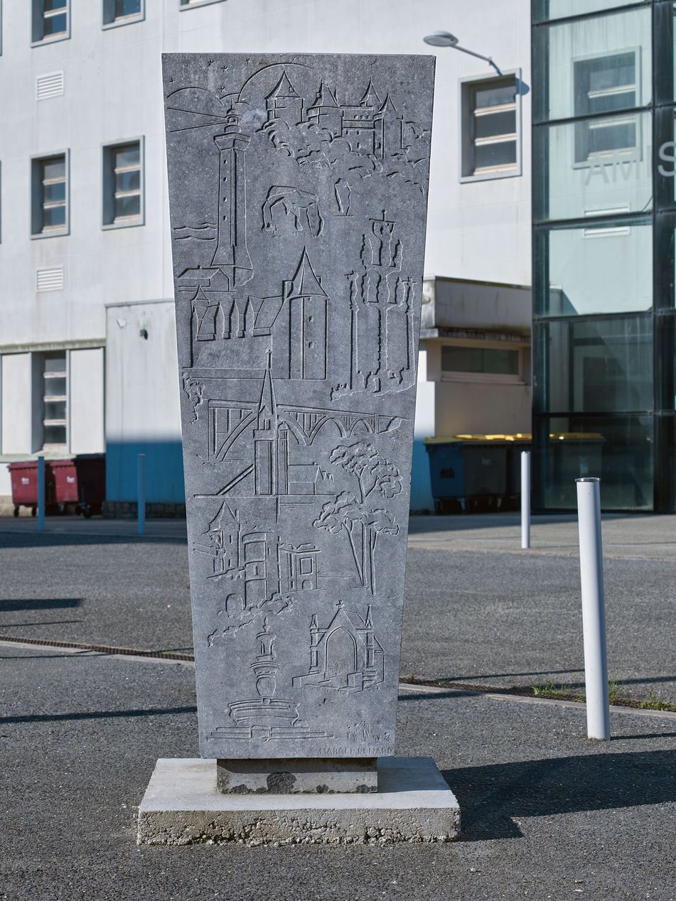 Marcel Renard (1893-1974), Obélisque sculpté sur les quatre faces (vers 1961). Sur cette face de haut en bas : le château de Combourg, le phare d'EckmühL, un dolmen et un menhir, le château de Josselin, le calvaire de Saint-Thégonnec, le viaduc et l'église Saint-Melaine de Morlaix; le château de Fougères et la porte de ville, la fontaine de Saint-jean-du-Doigt, autre fontaine.Immatriculation