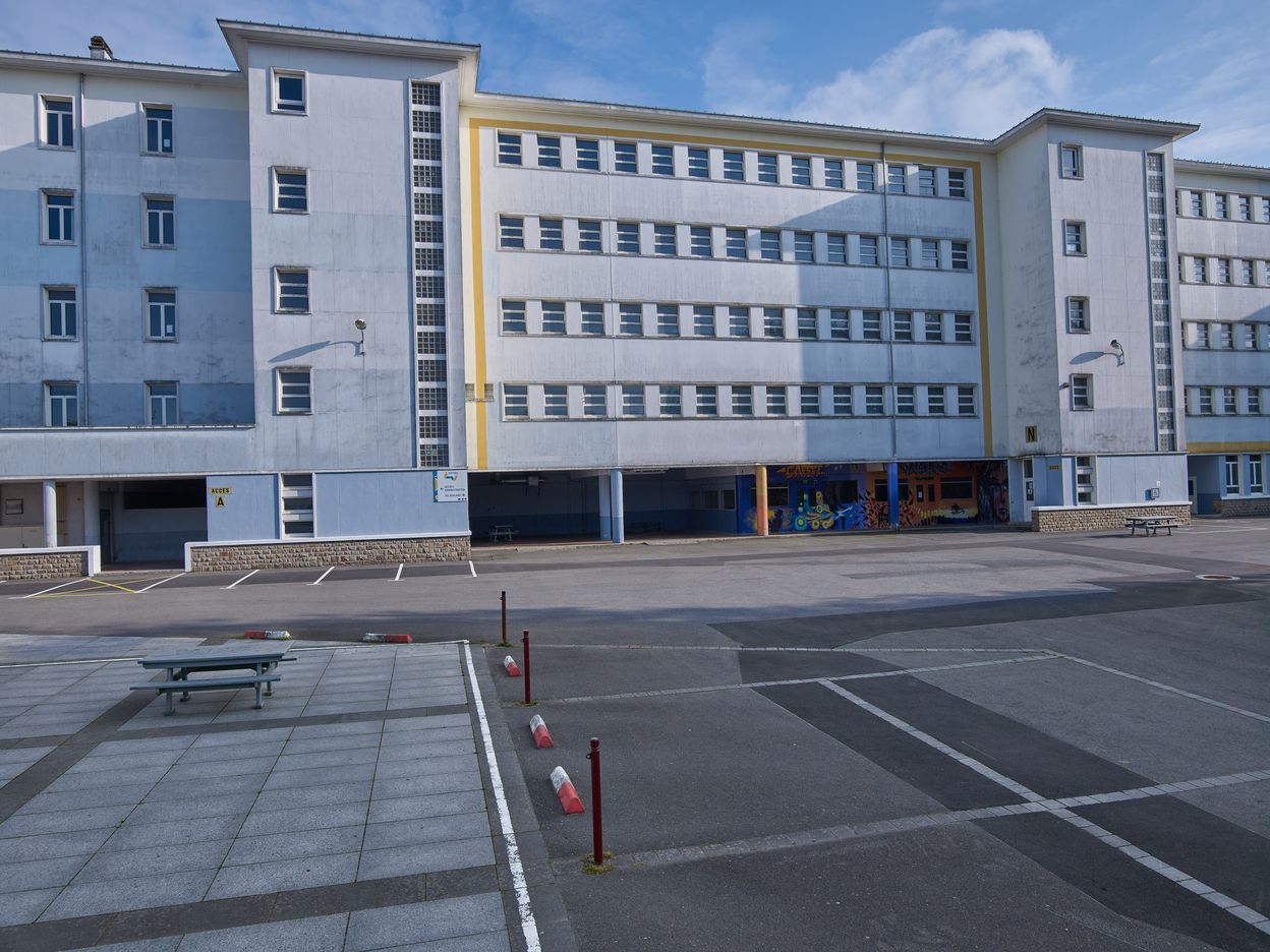 Bâtiment N, externat du lycée technique : "enseignement général et spécialisé garçons". Vue partielle de la façade nord, partie centrale avec deux cages d'escalier hors d'oeuvre. J-B. Mathon, architecte.Immatriculation