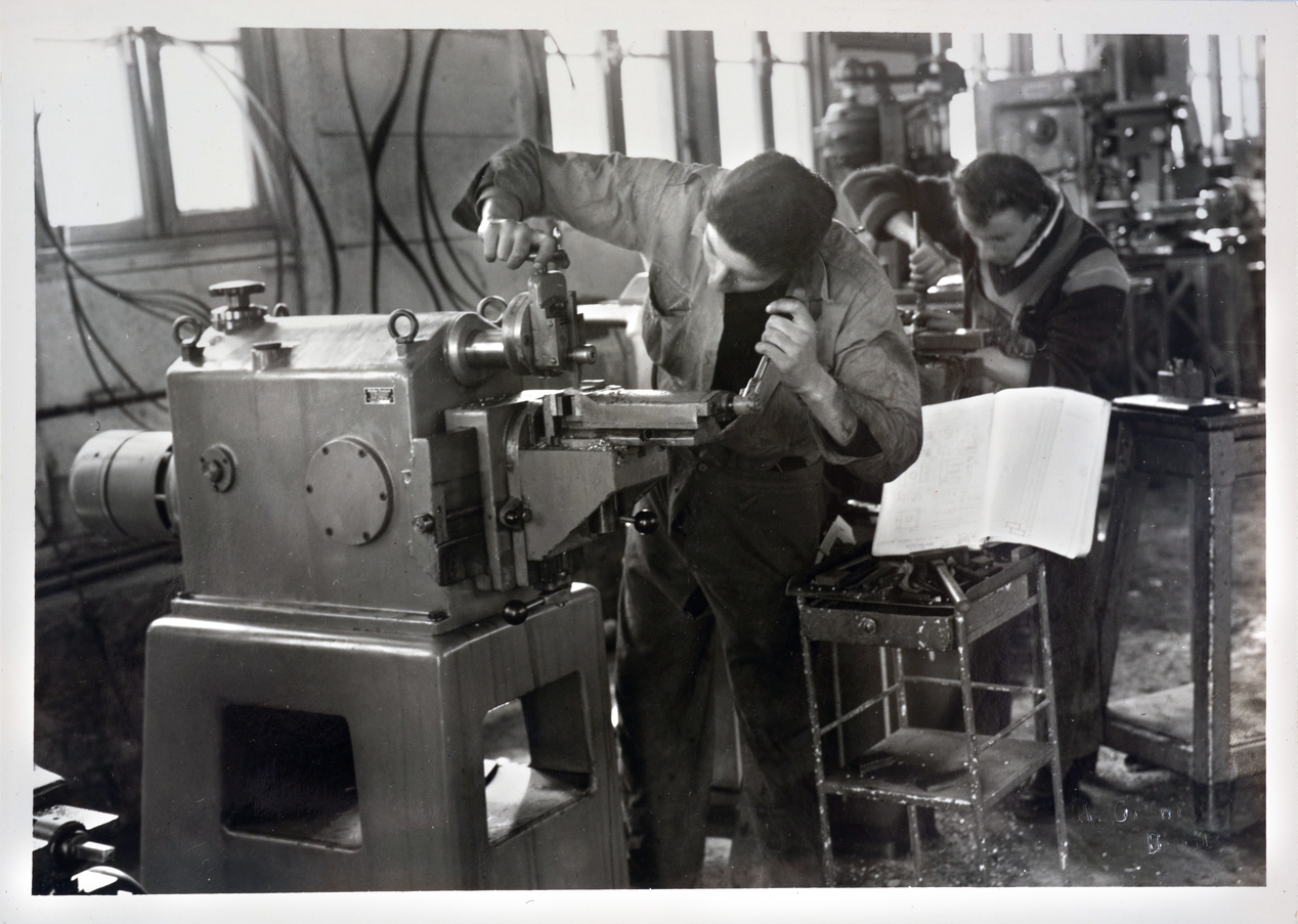 Collège technique en baraques. "1956. CT. Rue Sébastopol. Atelier M. Etau limeur hydraulique". (Entre guillemets, légende au dos de la photo).Immatriculation