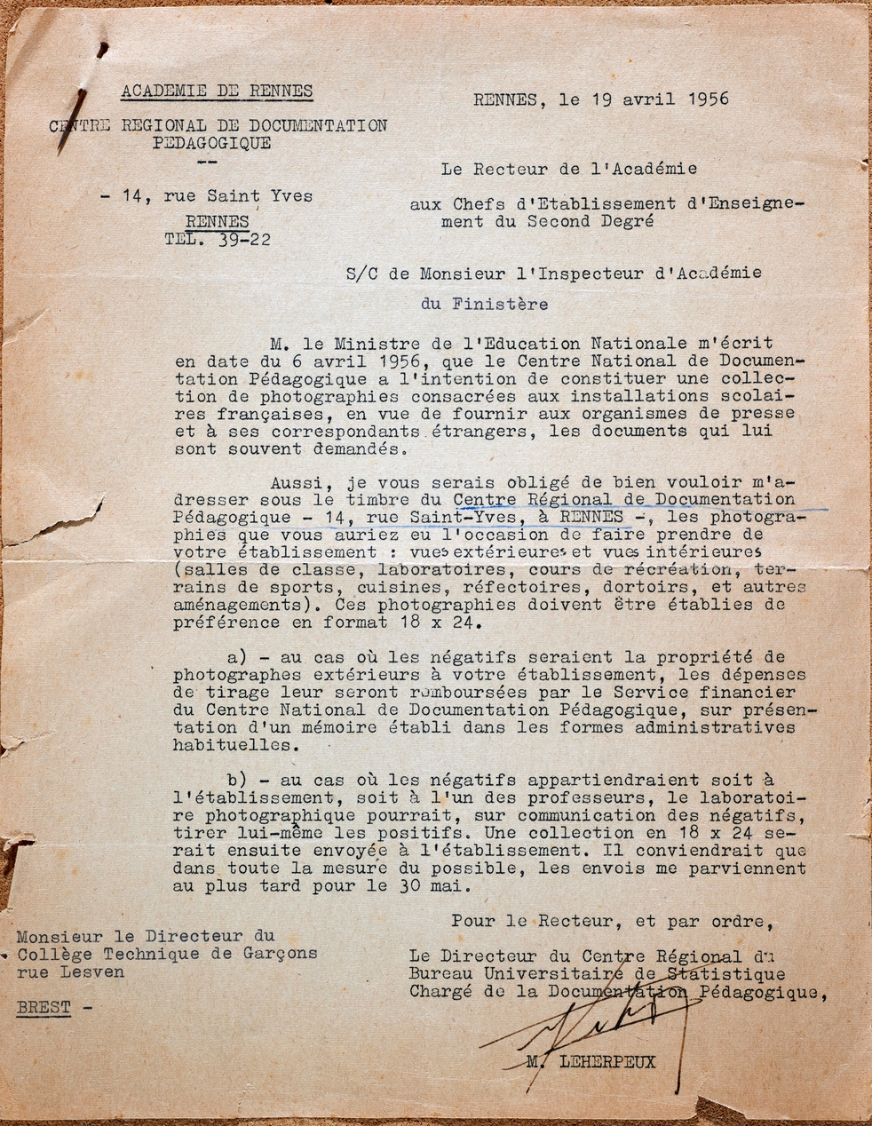LE 19/4/1956, le centre régional de la documentation pédagogique (CRDP) réclame aux proviseurs des photographies des installations scolaires françaises, en vue de constituer une collection destinée "aux organismes de presse". Le riche fonds de photographies des années 1950-1960 du lycée Vauban est-il à rattacher à cette demande ?Immatriculation
