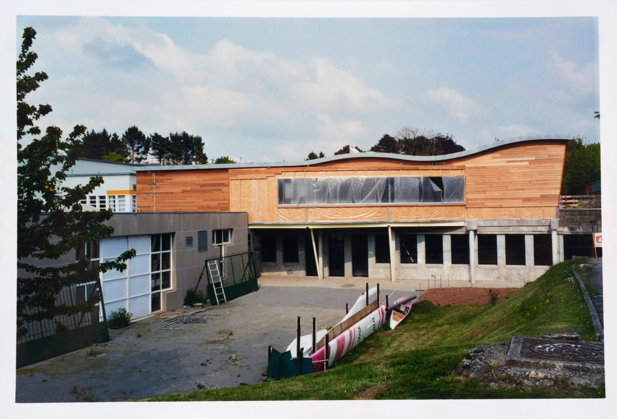 Vue de la façade ouest du CDI (Gildas Nédélec, architecte, 1997) en cours de construction.Immatriculation
