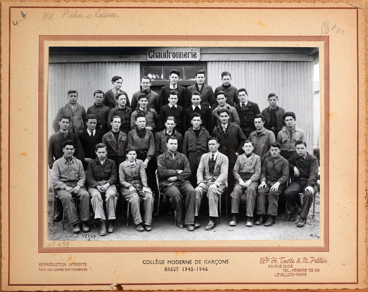 Collège moderne de garçons, Brest, 1945 - 1946. Photographie d'une classe devant l'atelier de chaudronnerie. Le "ColMo" est implanté temporairement, cette seule année scolaire, place de l'Harteloire, "autour de la cour de gauche, côté rue de l'Harteloire, dans une aile du lycée préfabriqué" (Olivier Corre, op. cit. dans les références documentaires du dossier.)Immatriculation