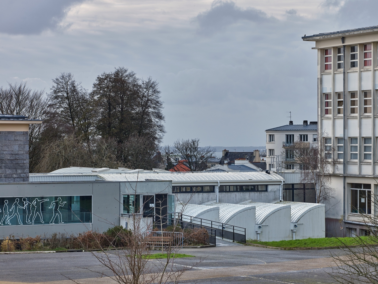 Façade nord du CDI : vue sur les toitures des salles de réunion. Gildas Nédélec, architecte, 1994. A gauche, vue partielle de la galerie de liaison. A droite, l'externat du lycée.Immatriculation