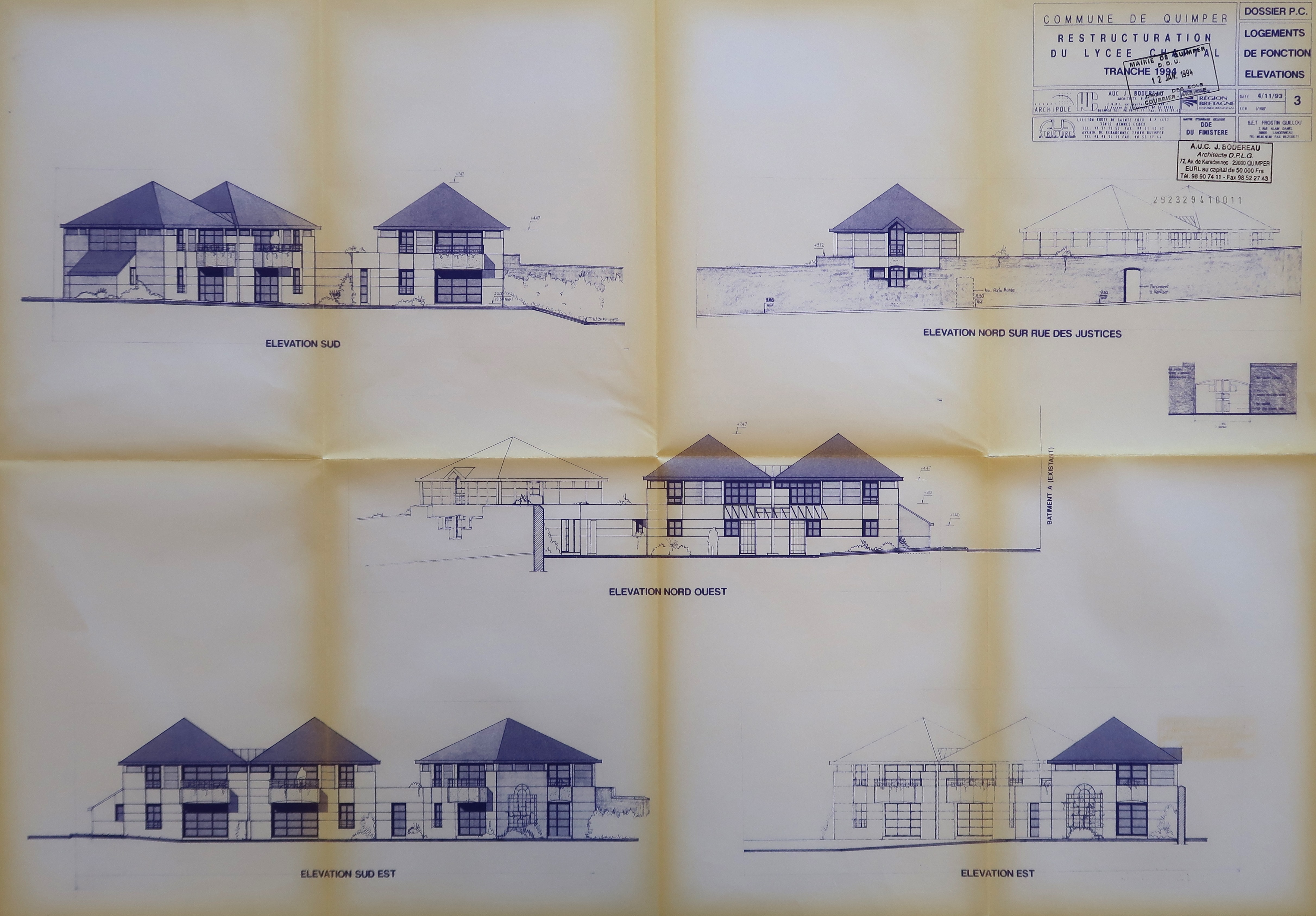Logements de fonction, élévations. Restructuration du lycée Chaptal, tranche 1994. Jean Bodereau, architecte, plans de novembre 1993. Noter l'insertion de l'un des logements dans le mur d'enceinte.Immatriculation