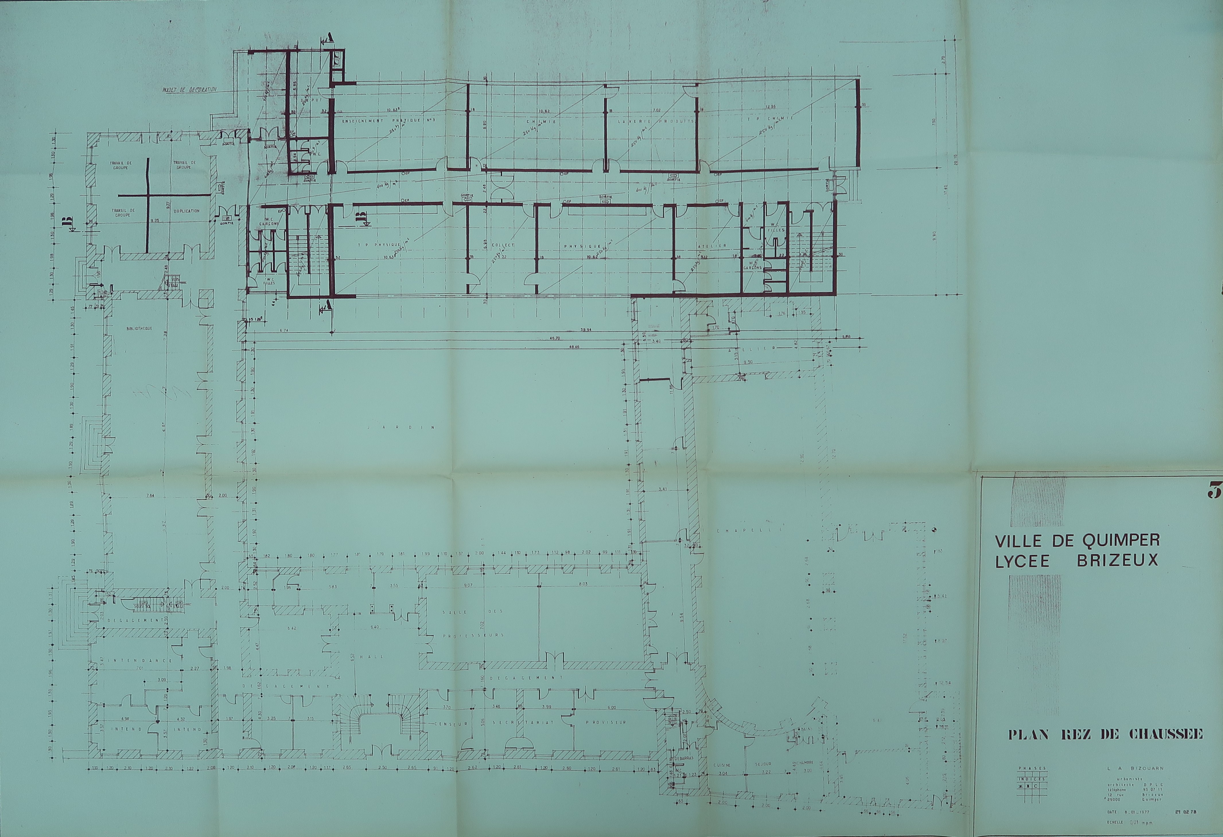 Plan du rez-de-chaussée du lycée Brizeux et de la nouvelle aile d'externat scientifique. En haut, à droite, l'emplacement de la décoration de Noël Pasquier. L.A. Bizouarn, architecte, plan daté du 21 février 1978.Immatriculation