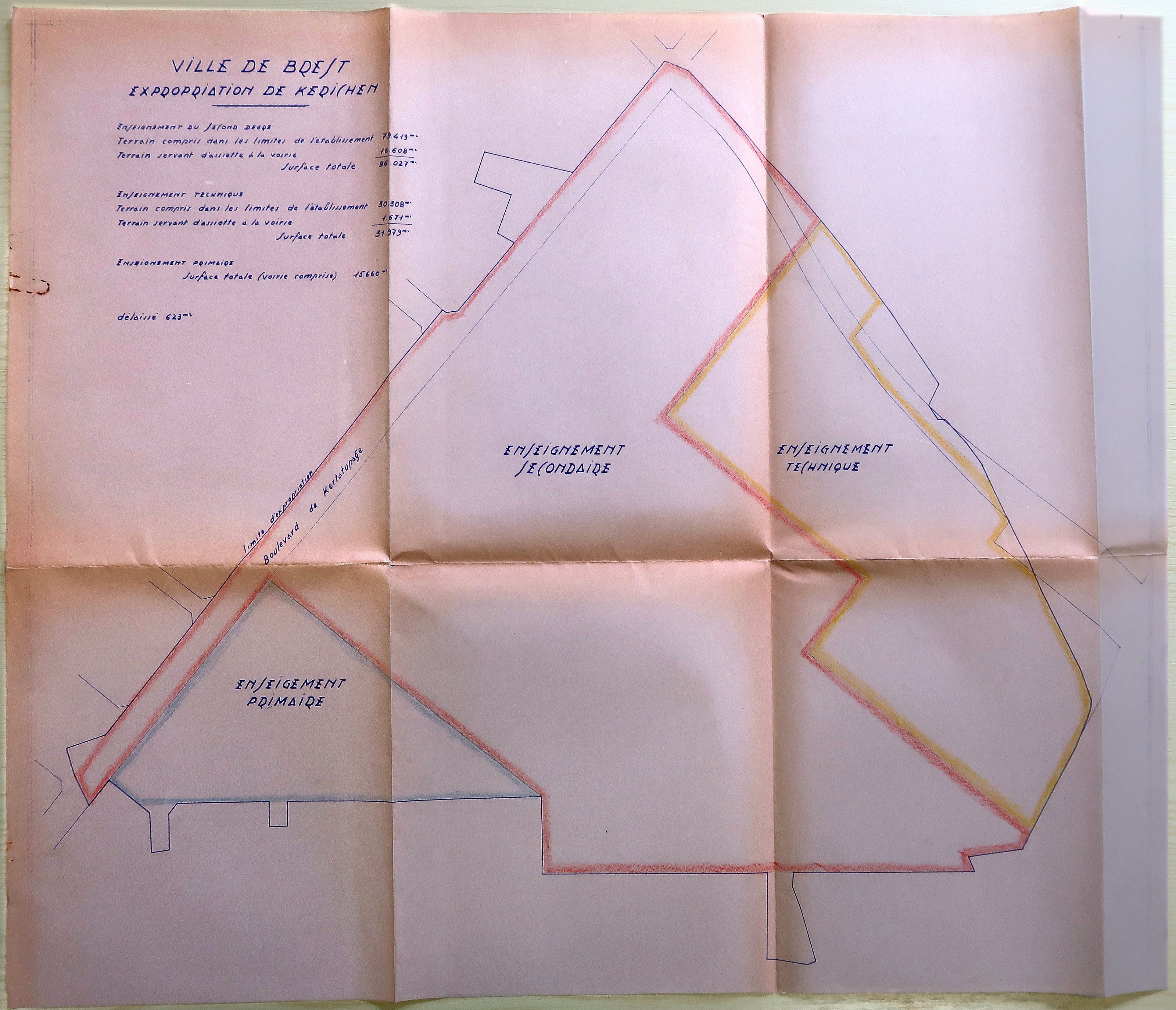 "Ville de Brest. Expropriation de Kerichen". Plan sans nom ni date (vers 1945-1950) sur lequel figure les espaces réservés à trois types d'enseignement : primaire, secondaire et technique et les surfaces : 17,4 ha environ, dont 12,8 ha pour le secondaire et le technique. L'achat de 2,4 autres ha sera nécessaire, quelques années plus tard, pour la construction des ateliers et 5157 mètres carrés pour les nouveaux ateliers des années 1980.Immatriculation