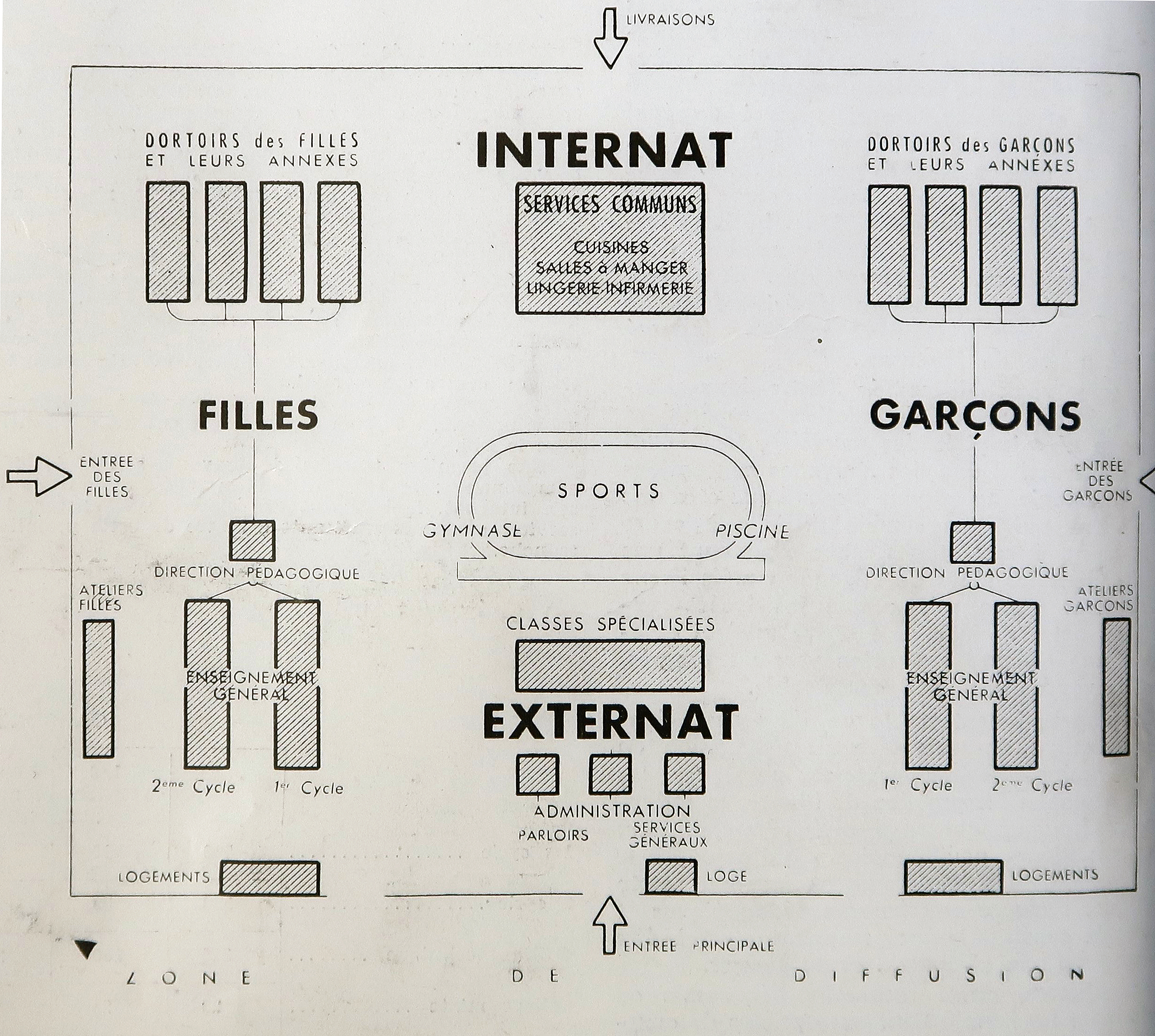Publication dans l''Architecture d'Aujourd'hui, n°34, consacré aux constructions scolaires (1951), du schéma de principe de la cité scolaire Kerichen. Le plan de masse de 1949 et des appréciations assez nuancées l'accompagnent.Immatriculation