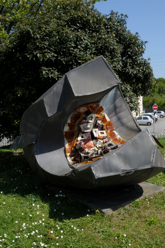La géode, sculpture d'Yslav, le 18 avril 2011, avant sa disparition entre 2011 et 2019. On constate la présence de la haie mentionnée par l'artiste, qui empêchait de voir la sculpture depuis la rue. Photographie réalisée par Marc Rapilliard, dans le cadre d'une campagne pour le dictionnaire des lycées publics de Bretagne, paru en 2012.Immatriculation