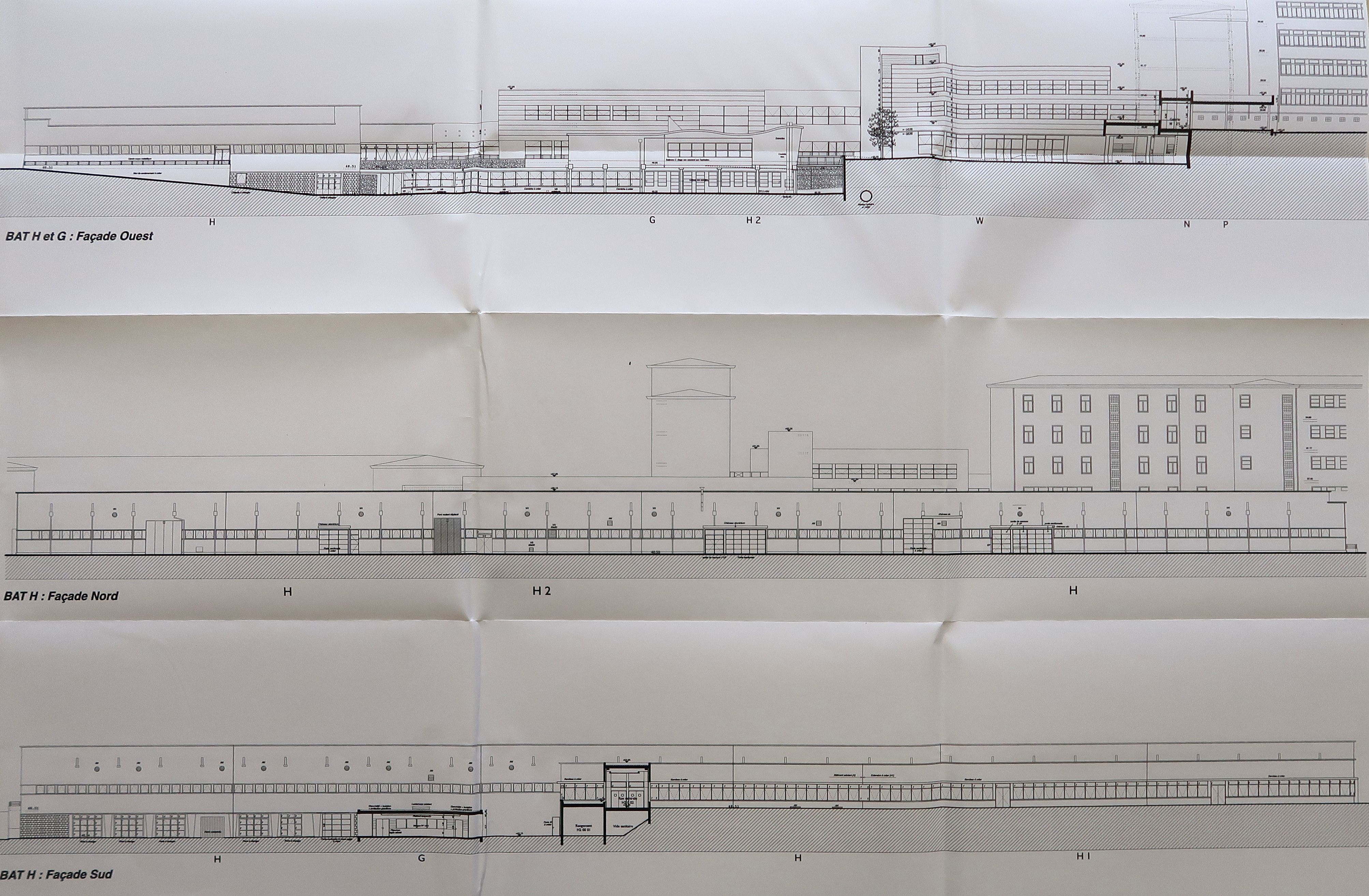 Elévation des façades ouest des bâtiment H et G, façades nord et sud du bâtiment H. Archipôle urbanisme et architecture, architectes, plans modifiés en 2006.Immatriculation