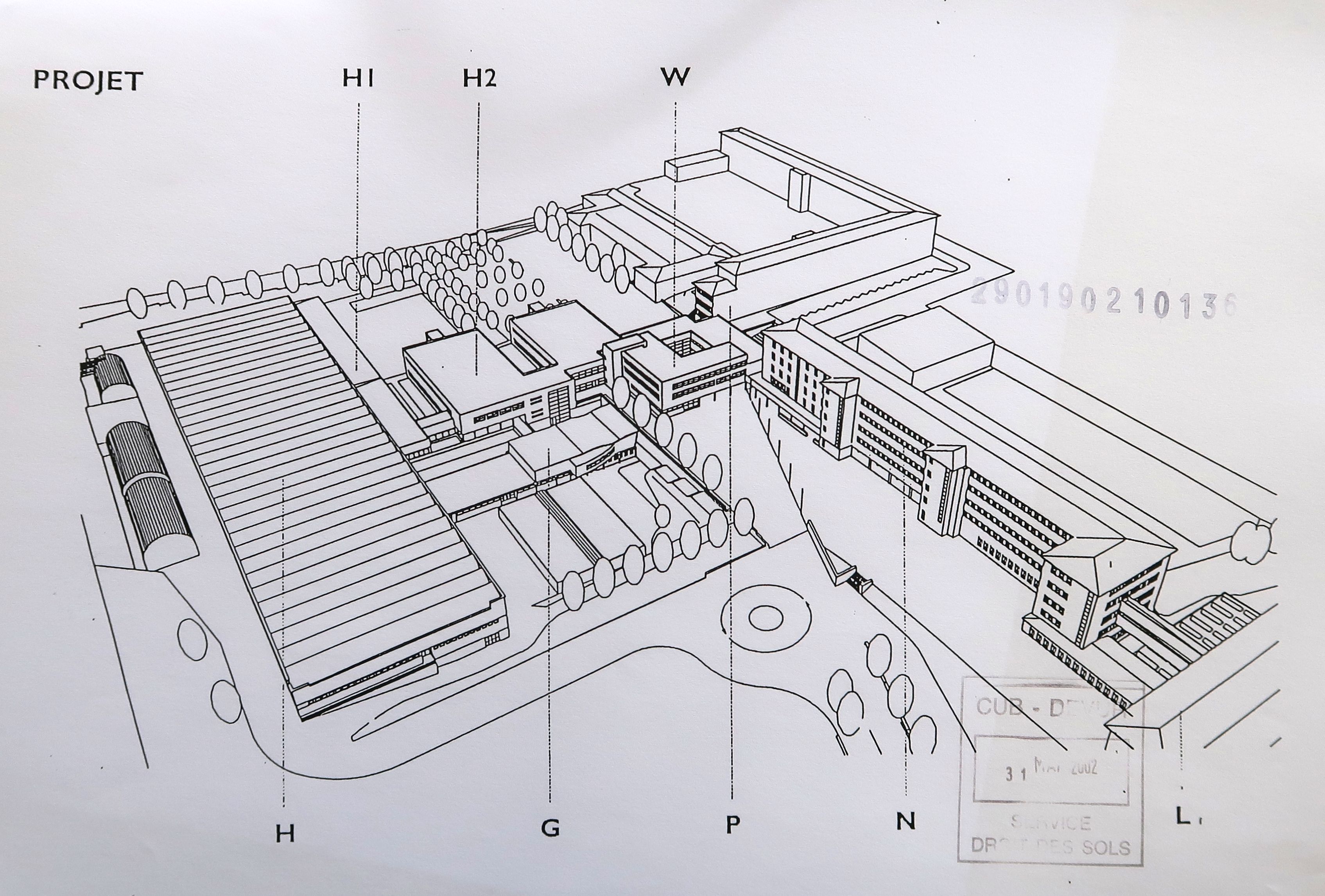 Vue perspective du lycée Vauban depuis le nord-ouest, présentant le projet de restructuration. Archipôle urbanisme et architecture, architectes, 2002-2006.Immatriculation