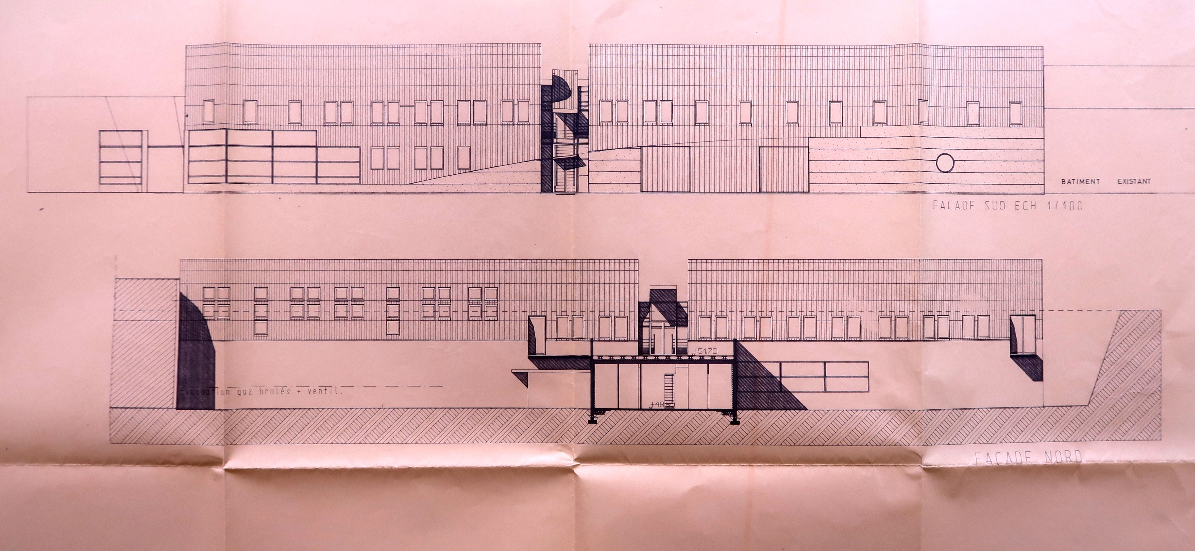 Ateliers et salles de technologie, façades sud et nord. Gildas Nédélec, architecte, 26 mars 1993.Immatriculation